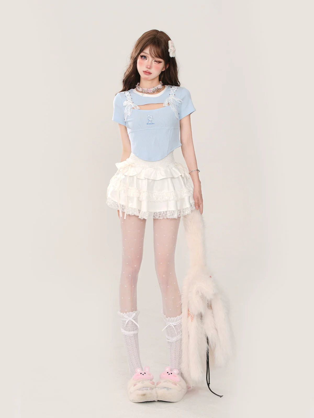 Blau-weißes Old School Lolita Fashion Kleid mit Schleife und Details, JSK-Set