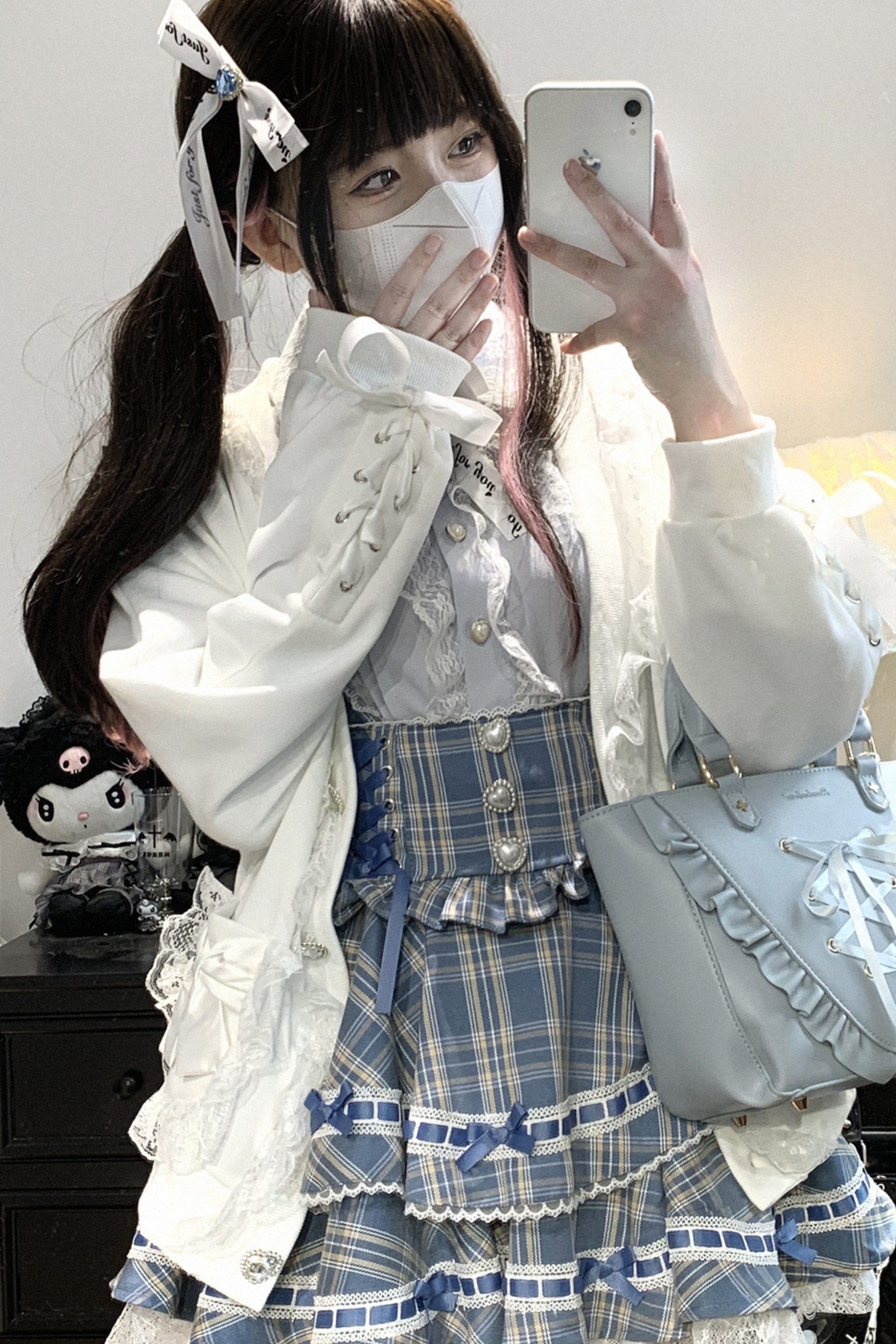 Blau-weißes Old School Lolita Fashion Kleid mit Schleife und Details, JSK-Set