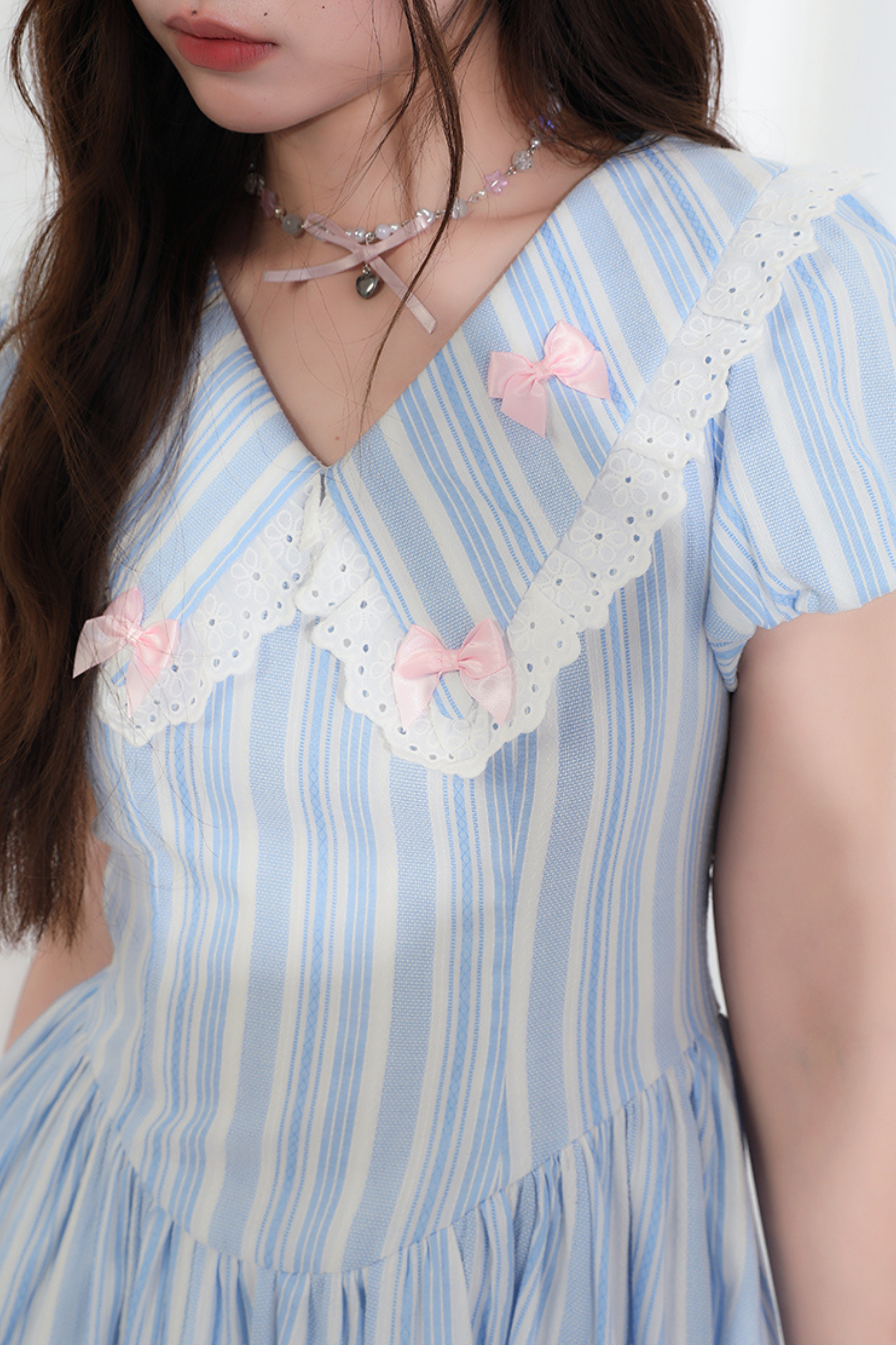 Blau-weißes Old School Lolita Fashion Kleid mit Schleife und Details, JSK-Set