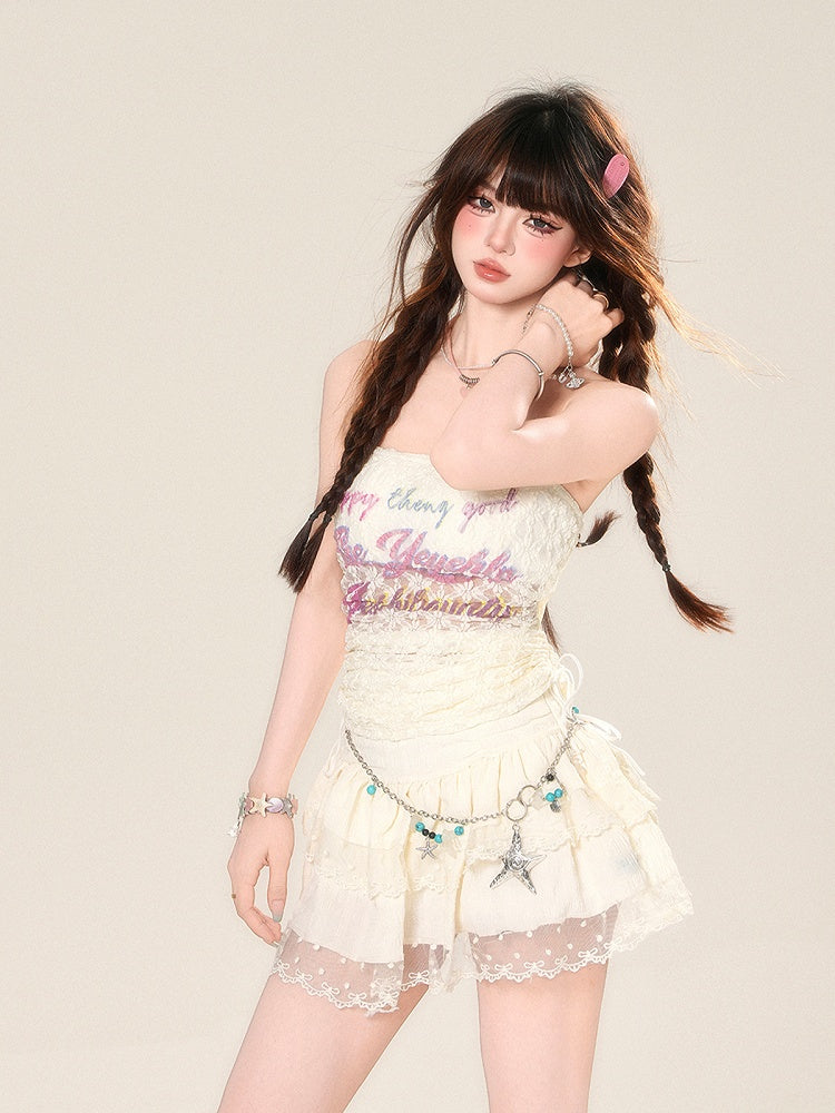 Lace Glamorous Trägerloses Top mit Buchstaben-Print in Apricot