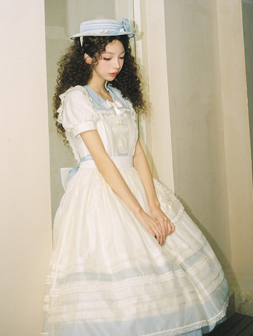 Lace Milk White Sailor Dress Puff Sleeves and Trim Collar Lolita with Light Blue