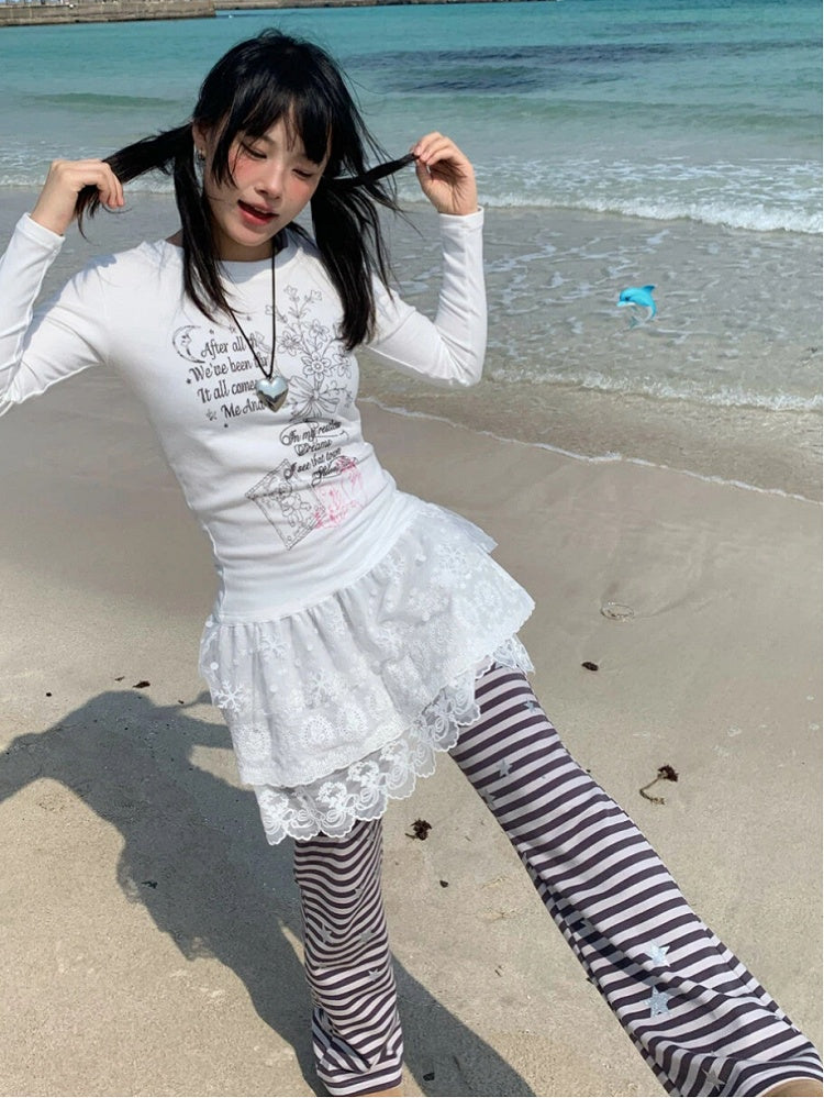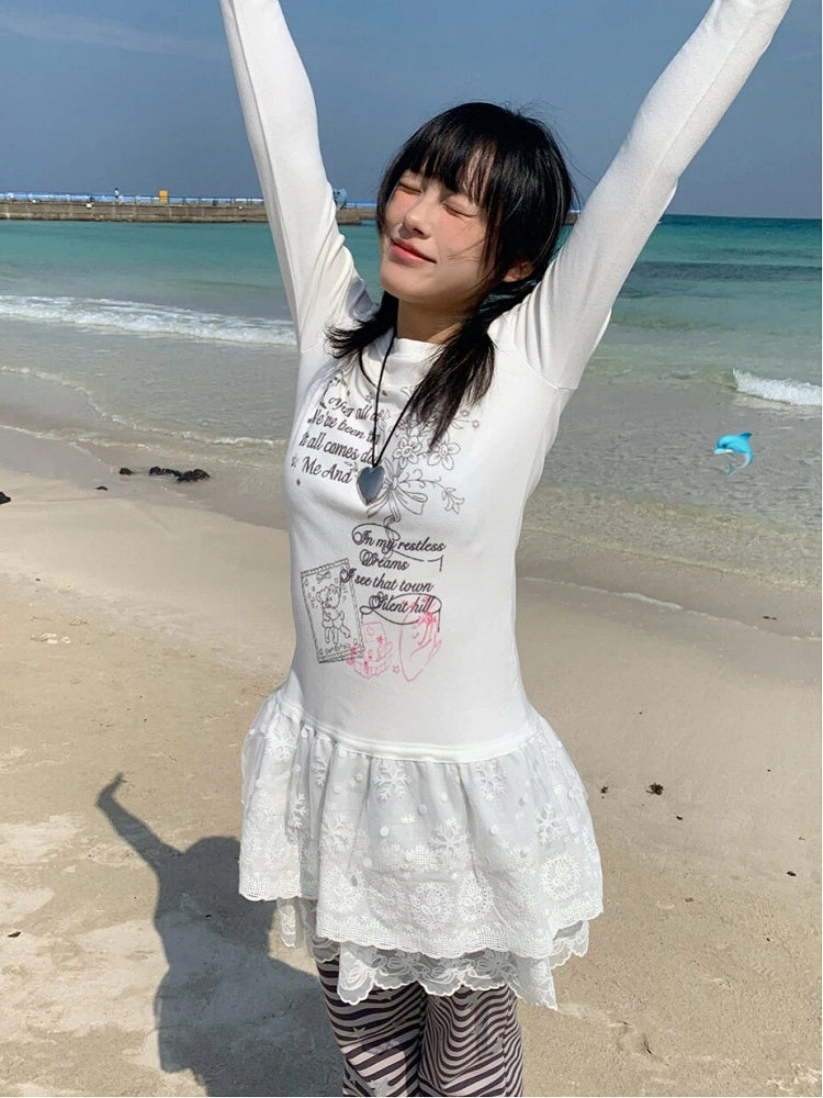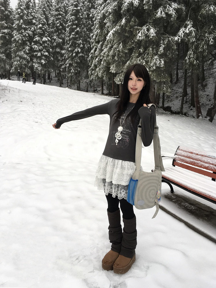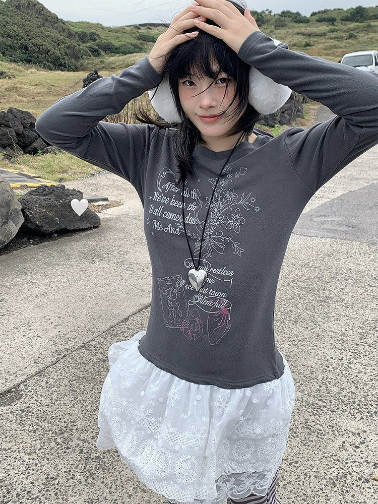 Lace Tiered Hugging Top Print Gray Bear White / with