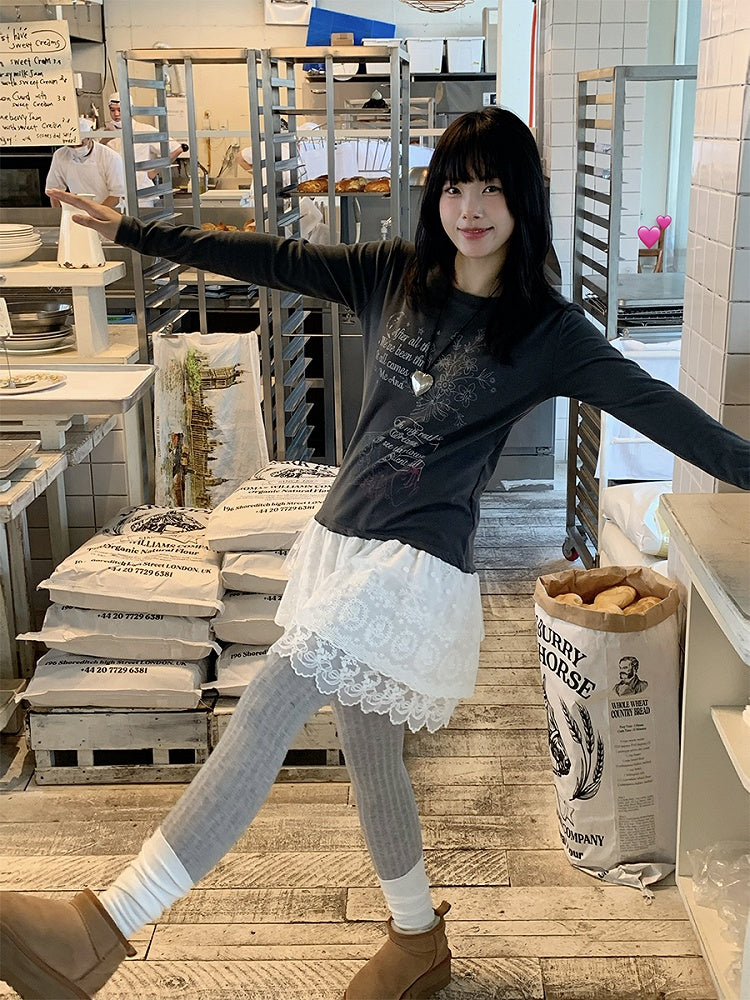 Gray / White Tiered Lace Top with Hugging Bear Print