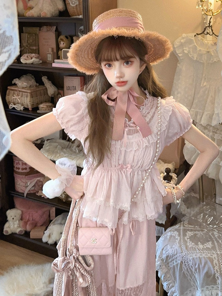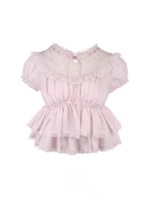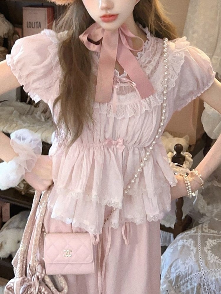 Rosafarbenes Top mit Spitzenbesatz, Puffärmeln und Schößchensaum