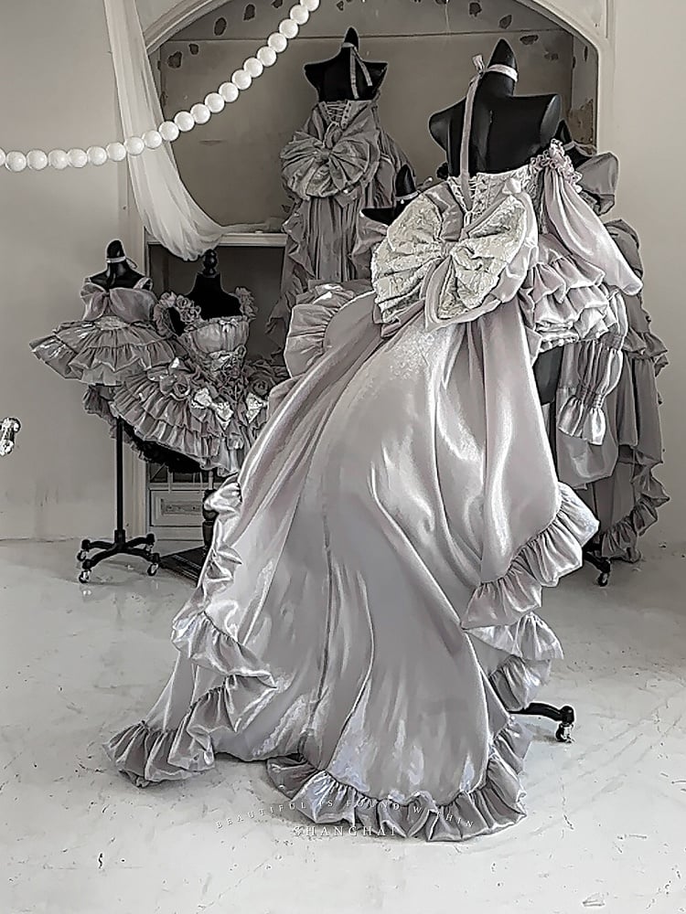 + Schnür-Ballettoberteil, komplettes Set, große Ärmel, Rock, Schleppe, Schleife, Korsett, silberfarben