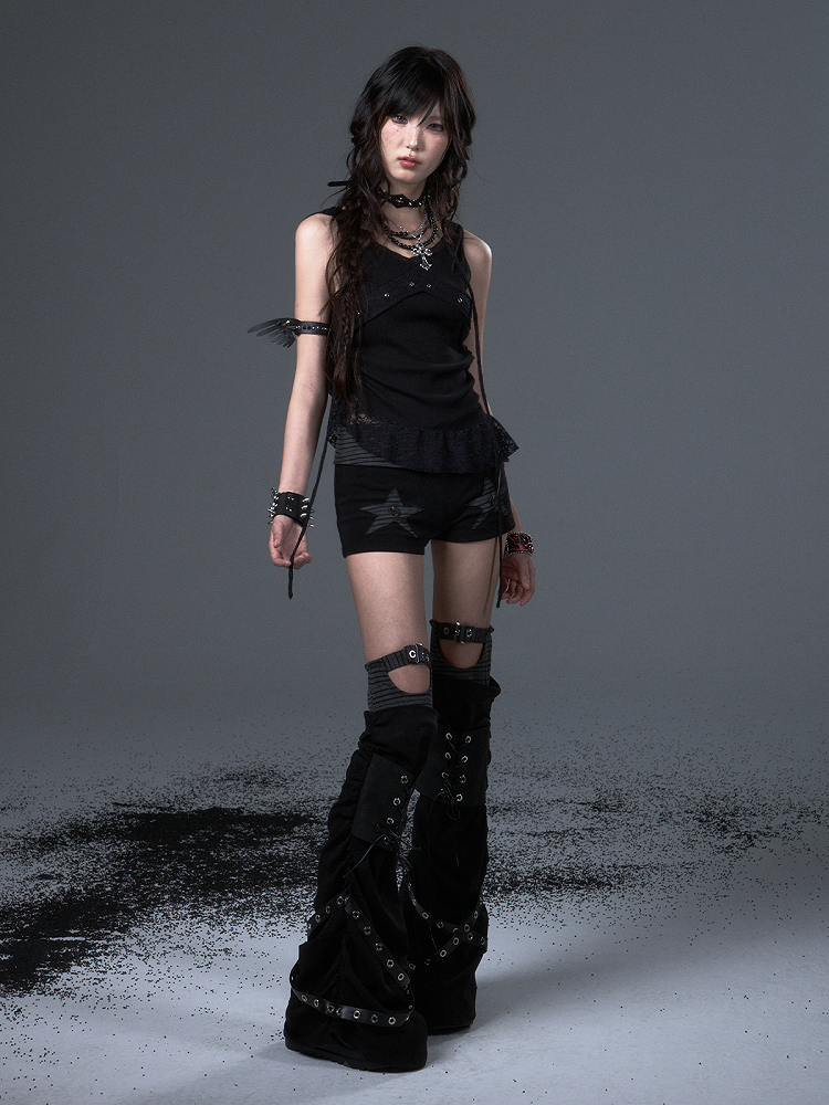 Schwarze Punk-Beinstulpen aus Strick mit Schnürung und Gürteln mit Metallnieten
