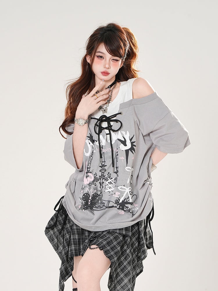 Schwarz/Graues T-Shirt mit Kerzenständer-Print und Schnürung vorne