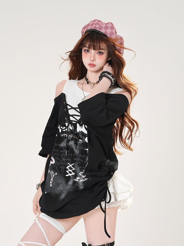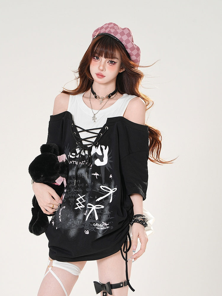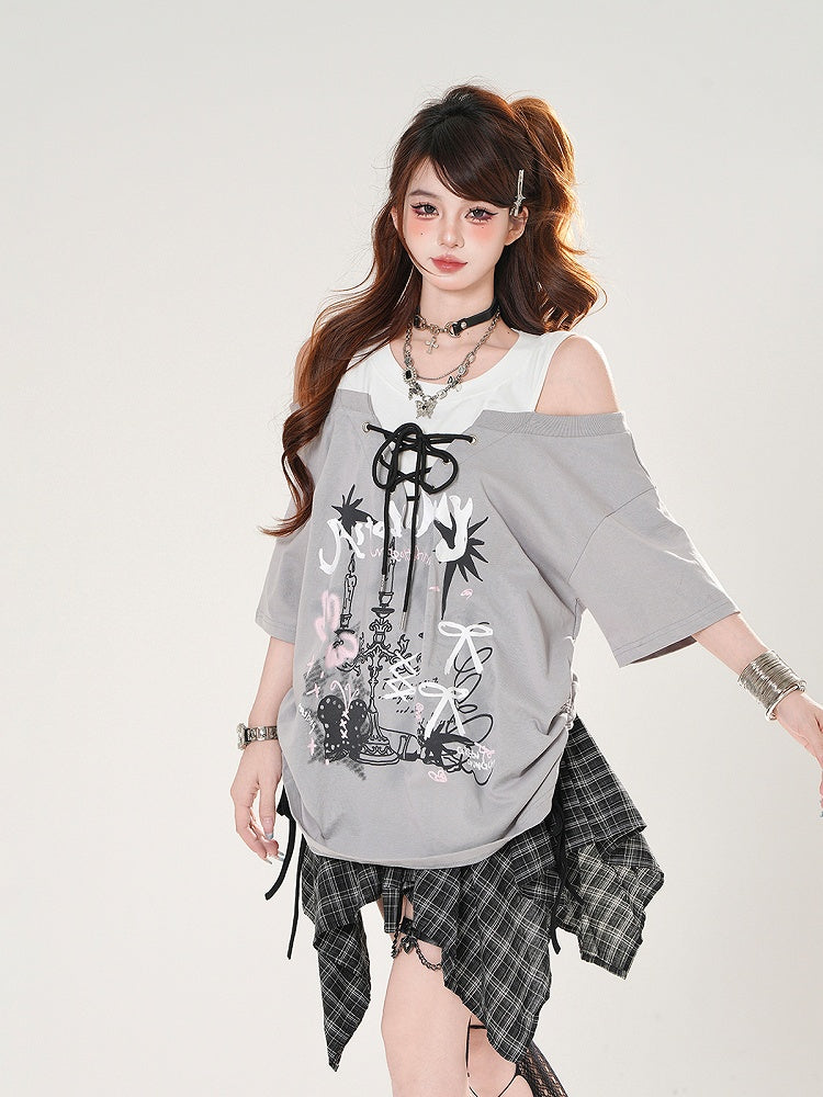 Schwarz/Grauer T-Shirt-Zweiteiler mit Schnürung vorne und Kerzenständer-Print