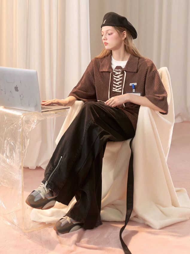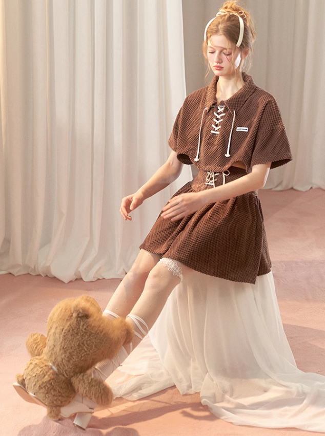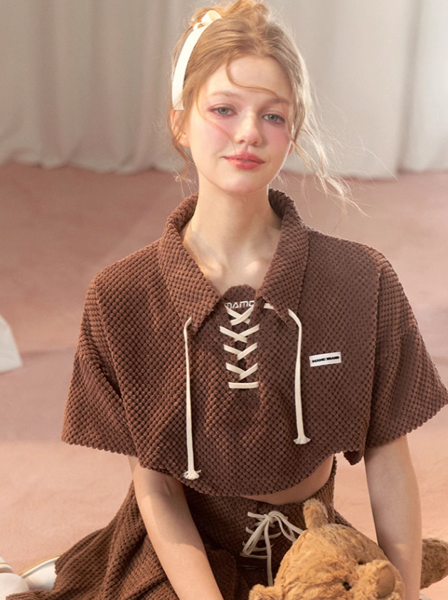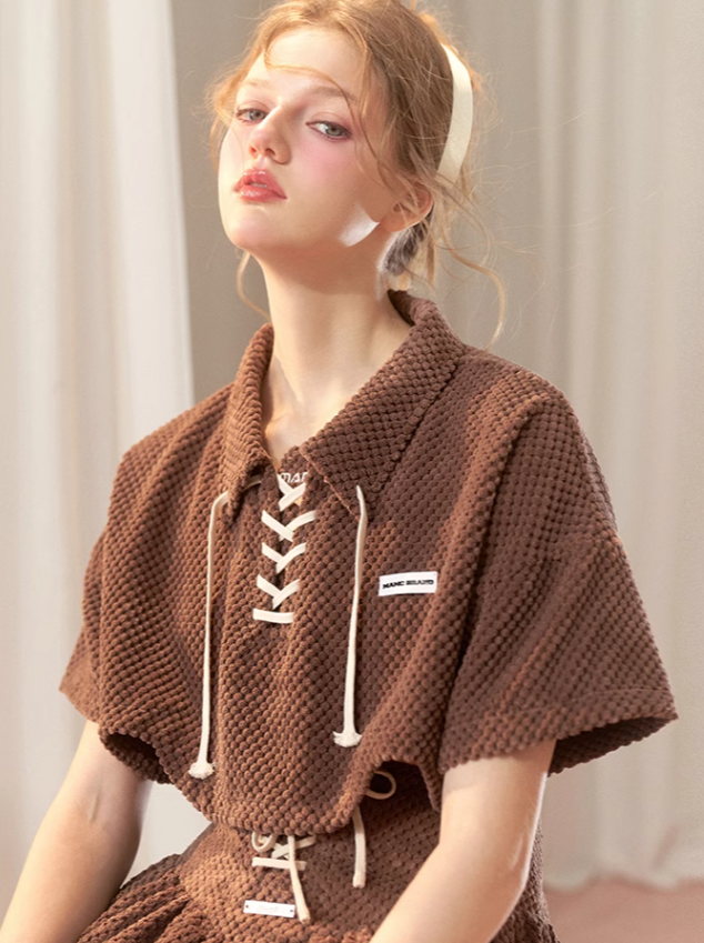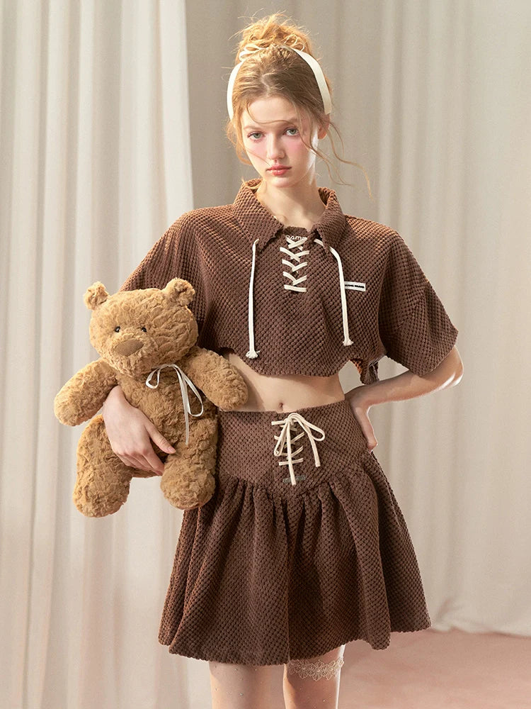 Machen Sie sich bereit, mit diesem bezaubernden Set alle Blicke auf sich zu ziehen! Das kurze Oberteil mit Schnürung und der ausgestellte Rock sorgen für einen koketten, femininen Look, während die Schnürung über dem Poloshirt für einen Hauch Verspieltheit sorgt. Perfekt für alle, die süß und stylisch aussehen möchten, ohne auf Komfort zu verzichten.