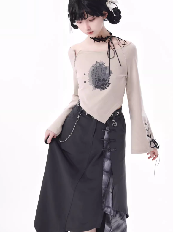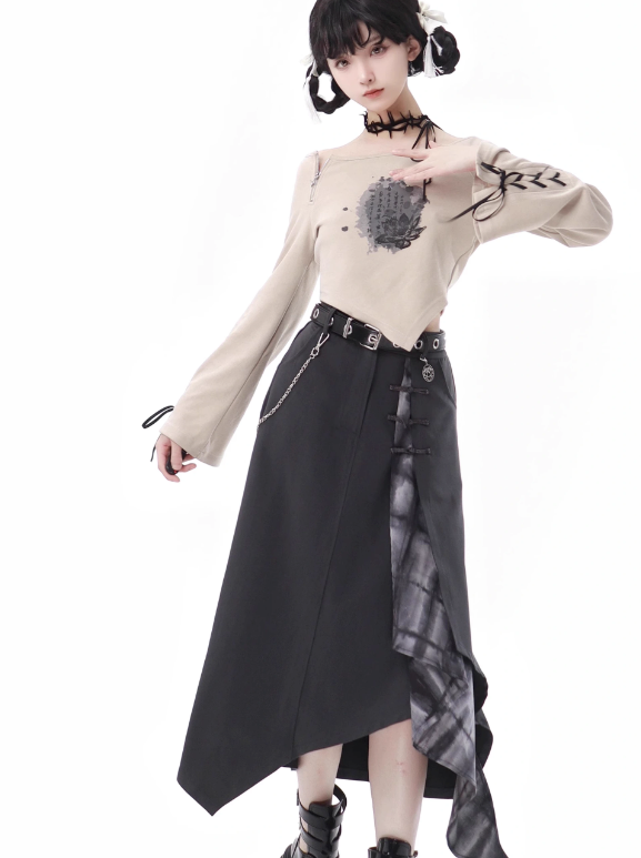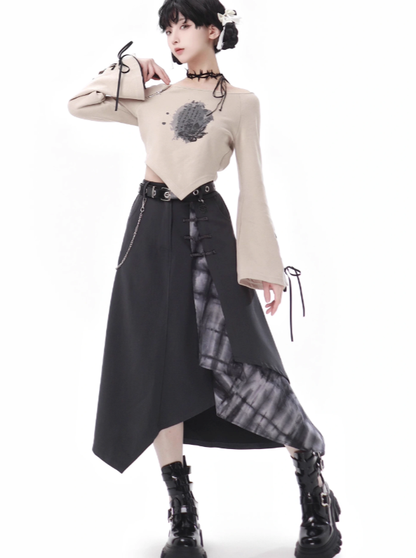 Dieses hübsche Rockset besteht aus einem beigefarbenen Oberteil mit Schnürung und Ärmeln sowie einem unregelmäßig weiten Rock für einen süßen und charmanten Look. Dieses Set ist perfekt für jeden Anlass und sowohl stilvoll als auch bequem.