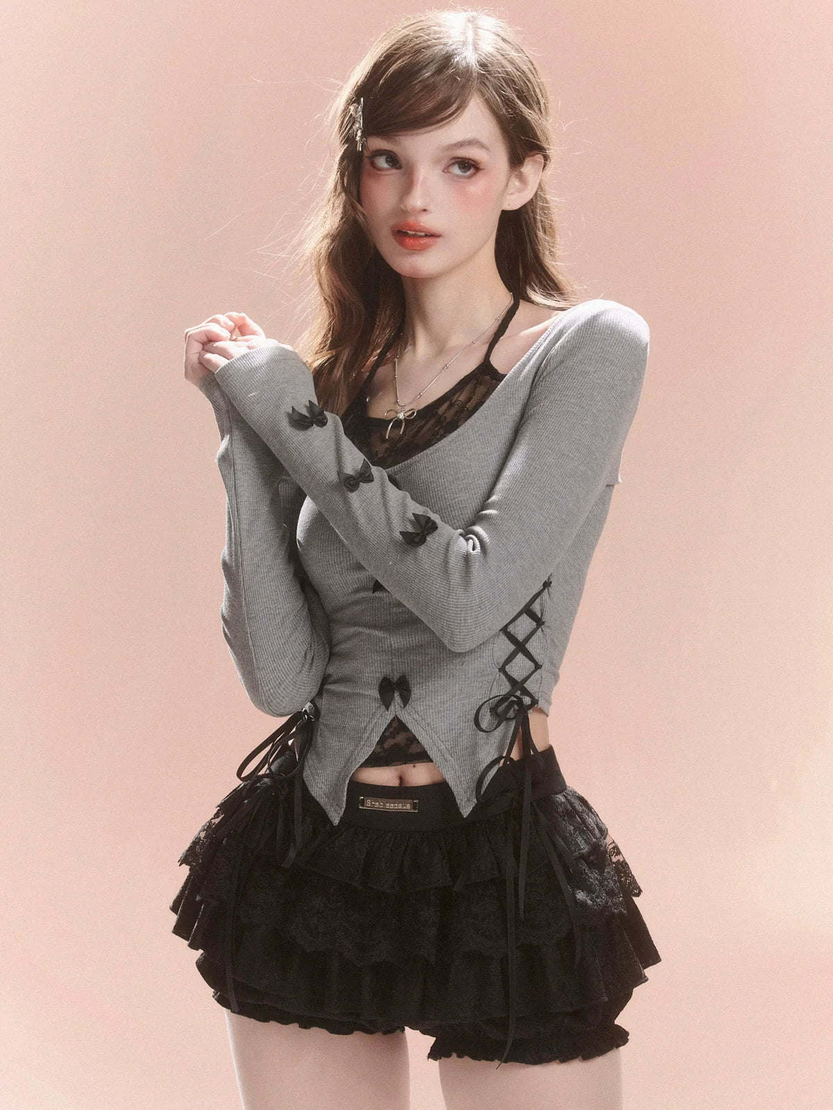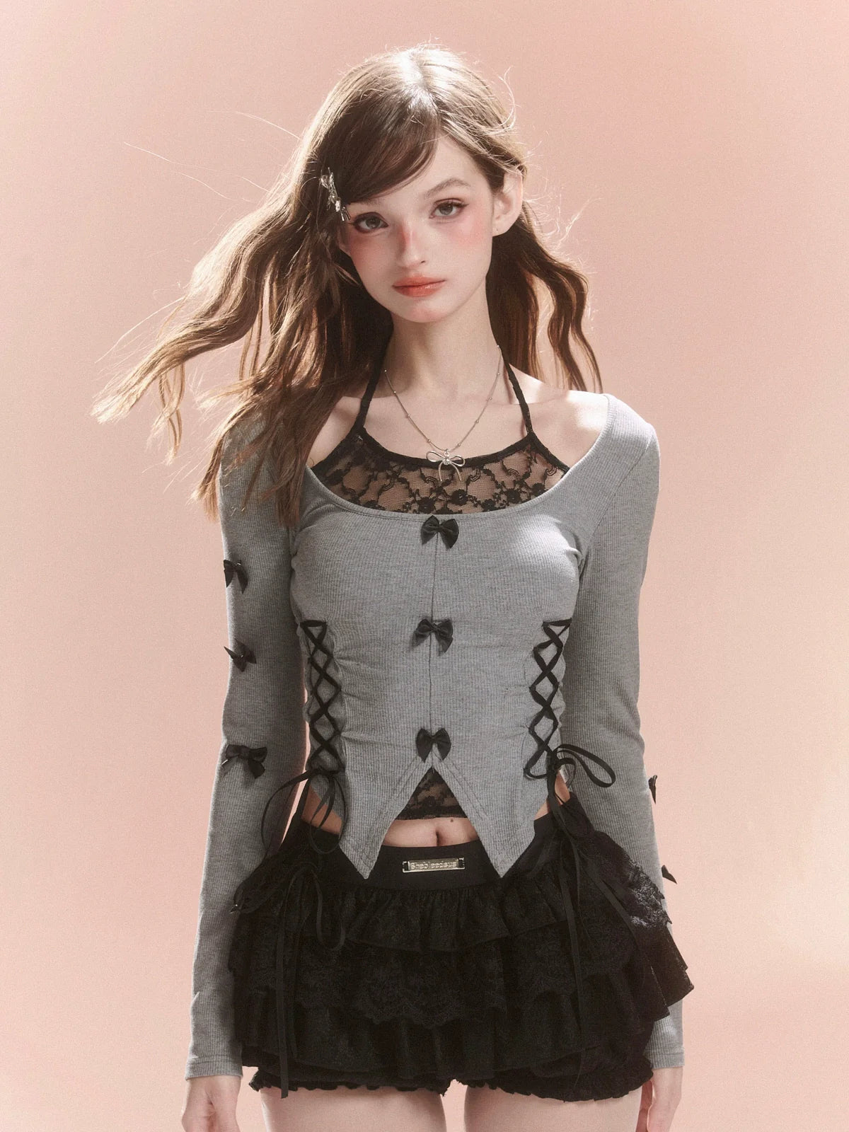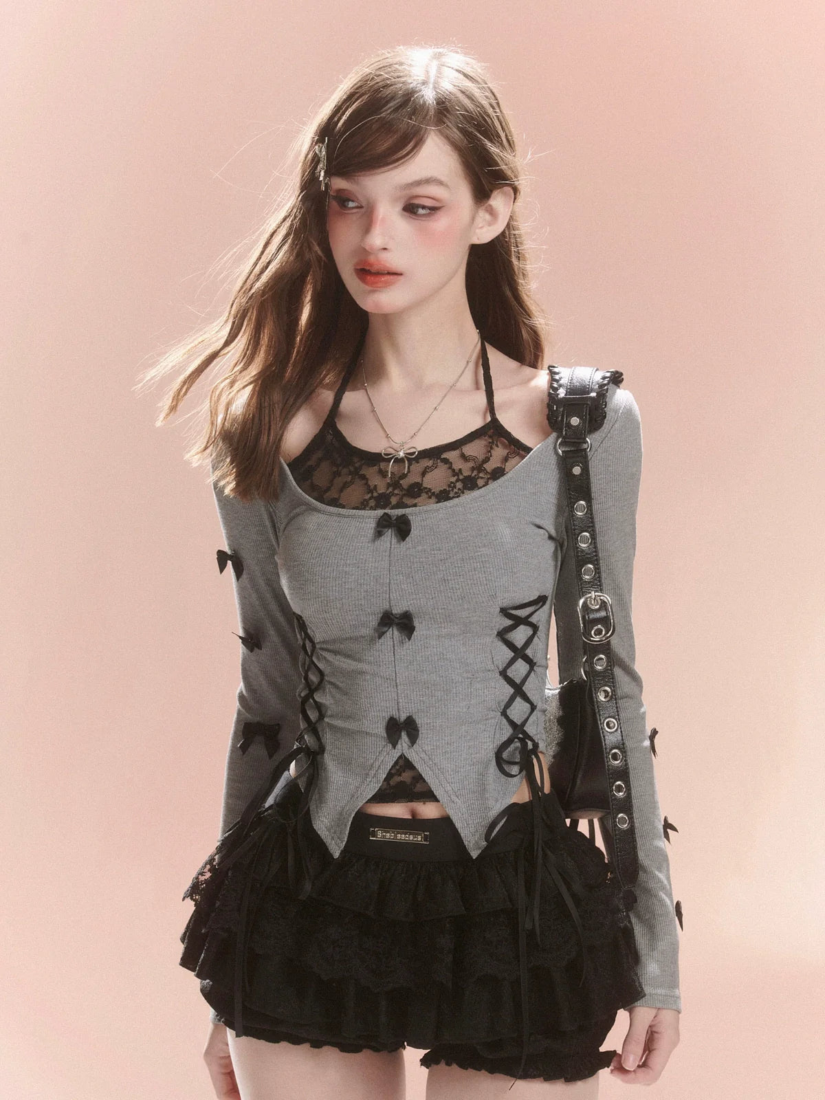 Dieses hübsche Top mit seitlichem Schlitz und Schnürung besticht durch sein zartes Schnürdesign und charmante Schleifenakzente. Perfekt für einen süßen und verspielten Look, ist dieses Top ein Must-have in jeder modischen Garderobe.