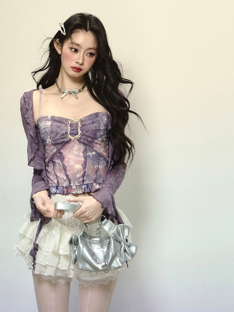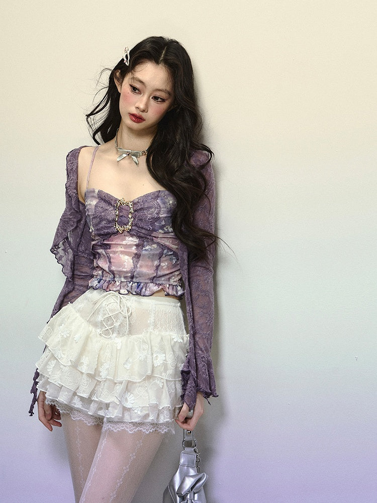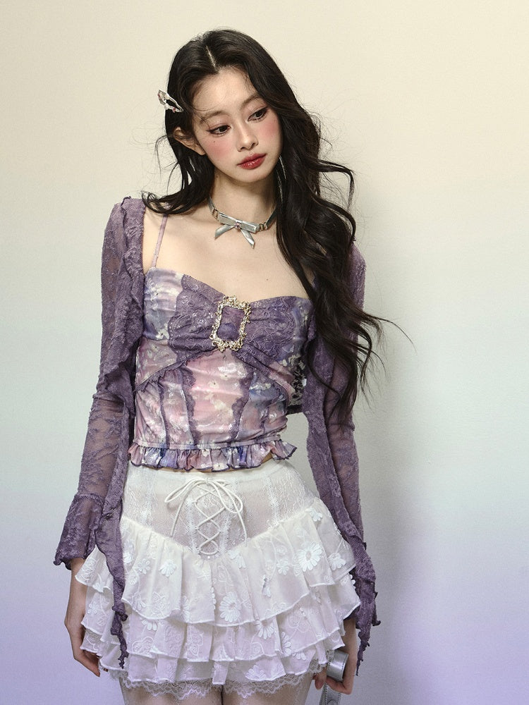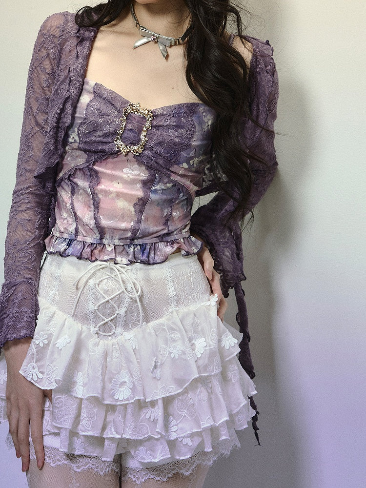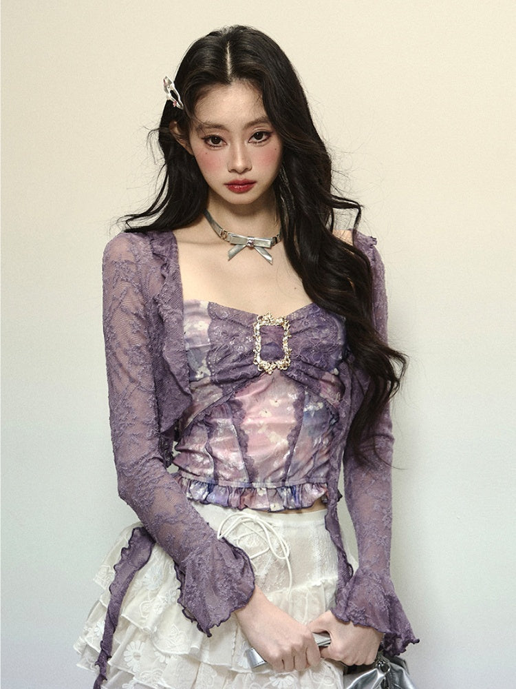 Lavendelfarbenes, halbtransparentes Spitzentop mit offener Knopfleiste