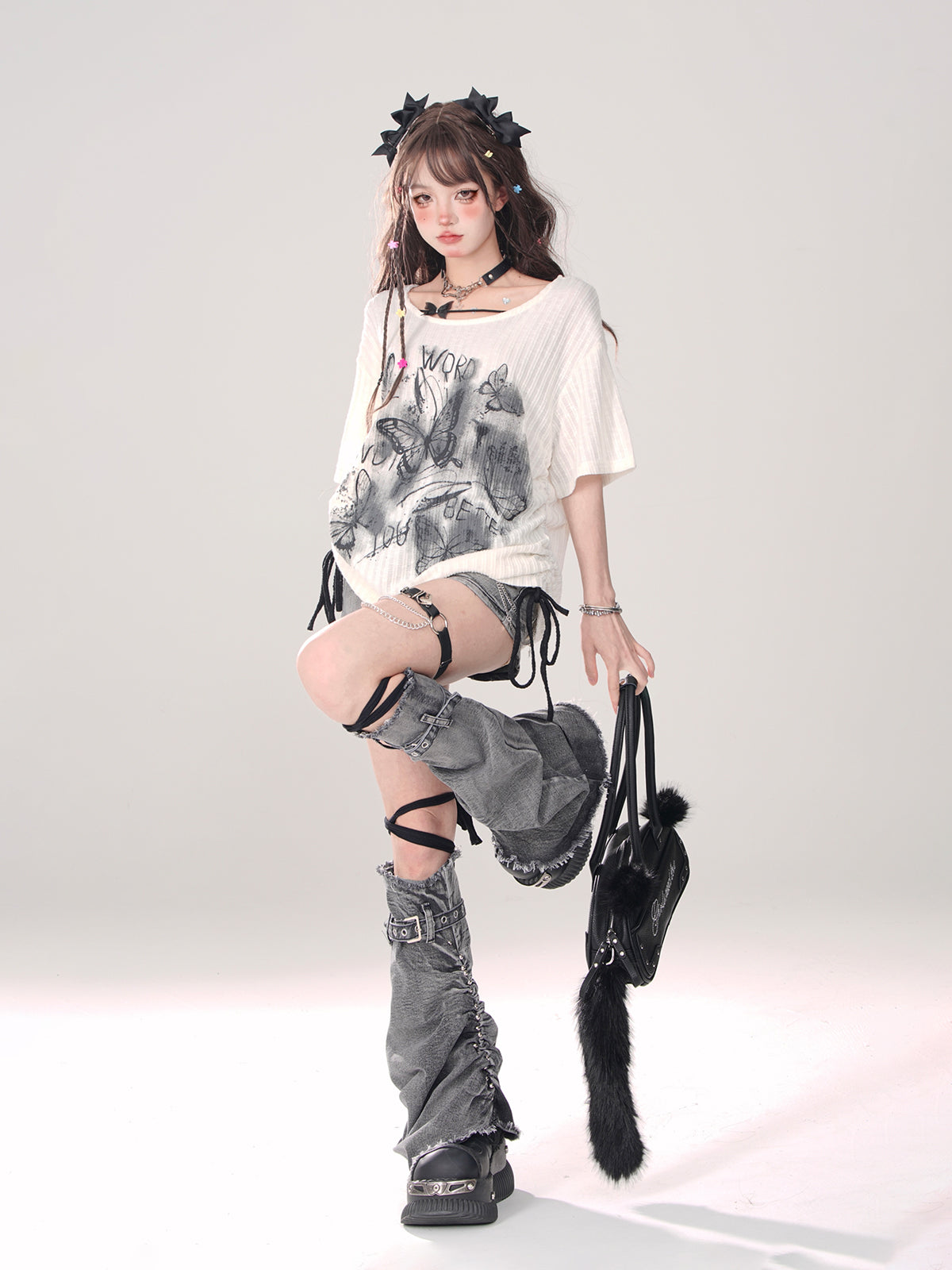Bleiben Sie gemütlich und stilvoll in unseren grau-blauen Beinwärmern + Jeansshorts A-Linie. Diese bezaubernden Stulpen halten Ihre Beine warm und verleihen Ihrem Outfit einen Hauch von Niedlichkeit. Perfekt für den Alltag, sind diese Stulpen ein Must-have für jede Fashionista.