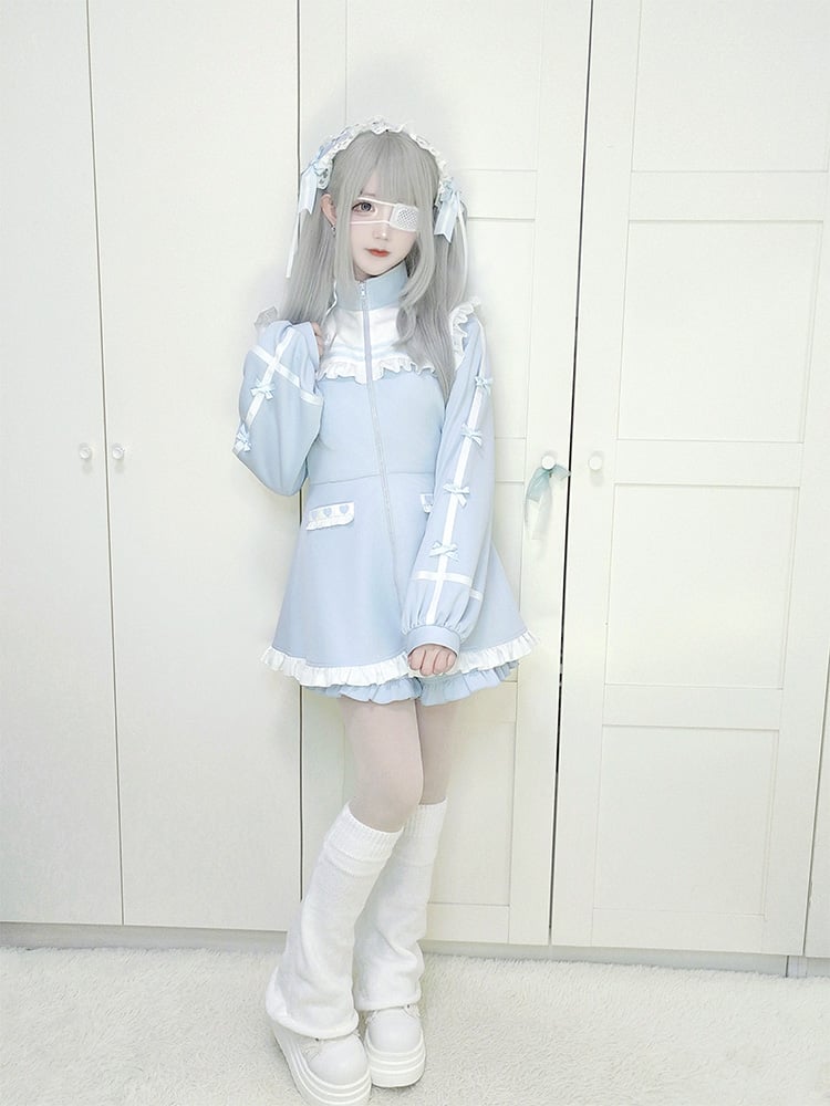 Blau-weißes Old School Lolita Fashion Kleid mit Schleife und Details, JSK-Set