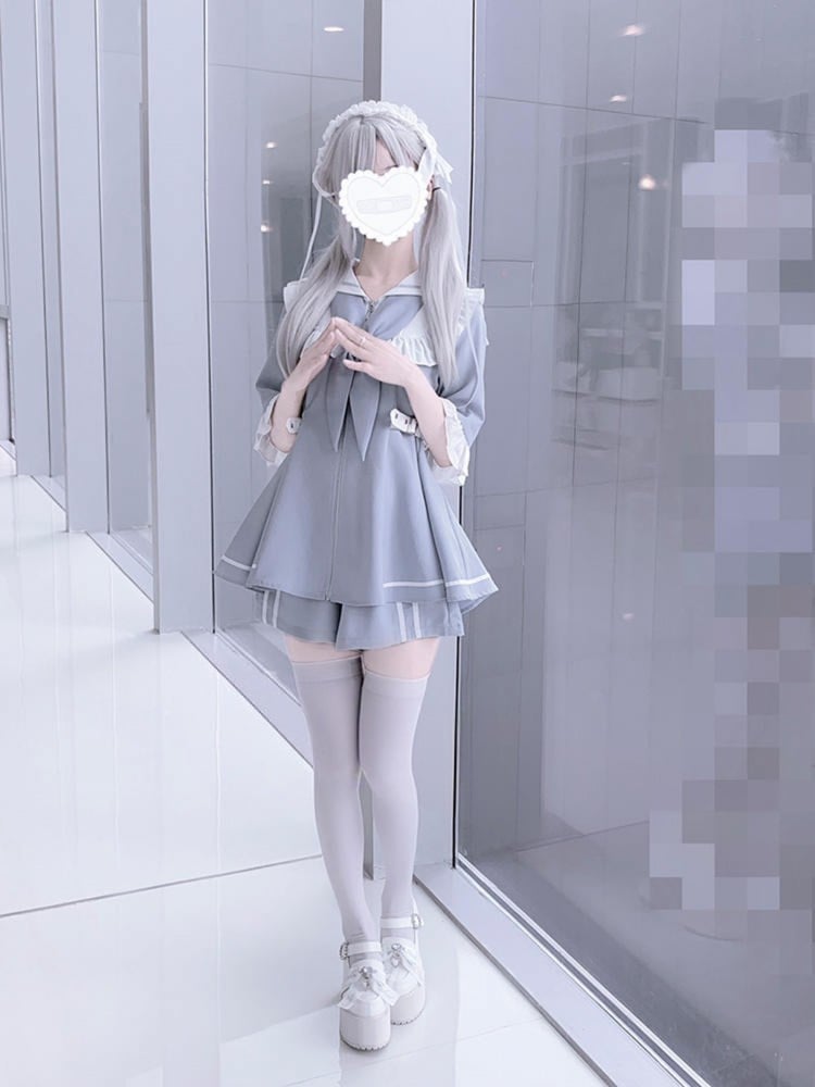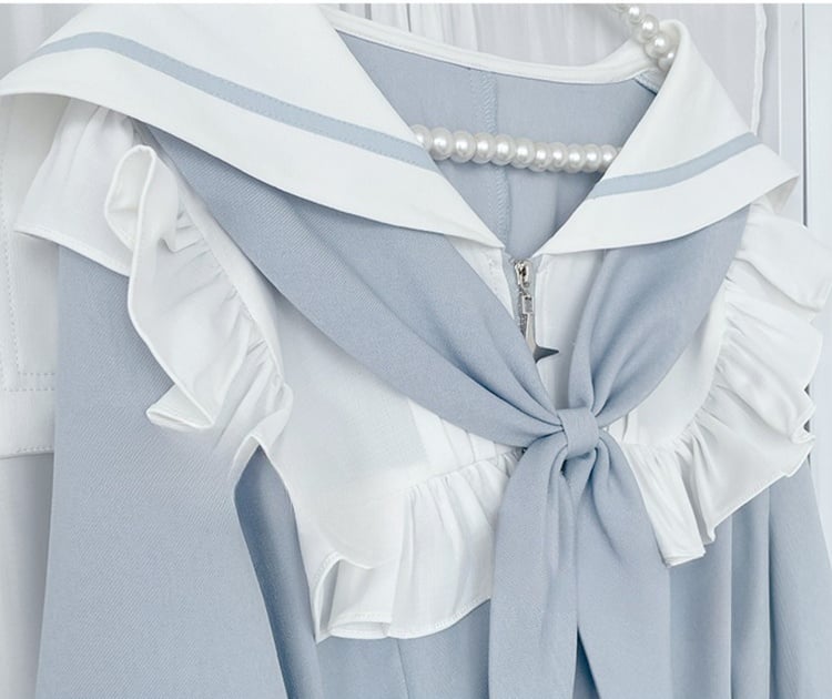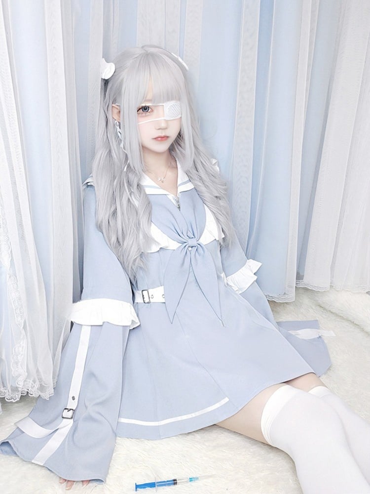 Hellblaues Jirai Kei-Komplettset mit Matrosenkragen und abnehmbaren Ärmeln