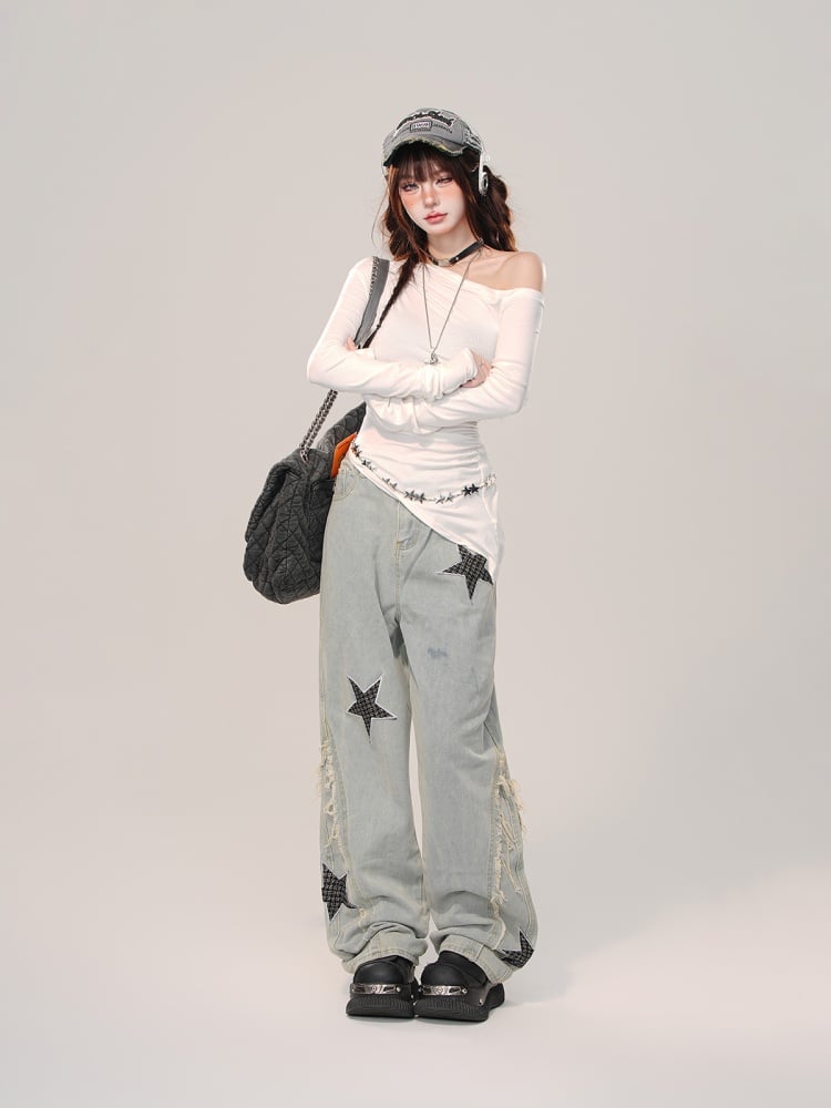Machen Sie sich bereit, in dieser bezaubernden High Street Wide-Leg-Jeans mit hellblauen Sternen alle Blicke auf sich zu ziehen. Die hellblauen Sterne verleihen dieser trendigen und vielseitigen Wide-Leg-Jeans einen Hauch von Niedlichkeit. Perfekt für jeden Anlass, wertet diese Jeans Ihren Stil auf und lässt Sie aus der Masse hervorstechen.