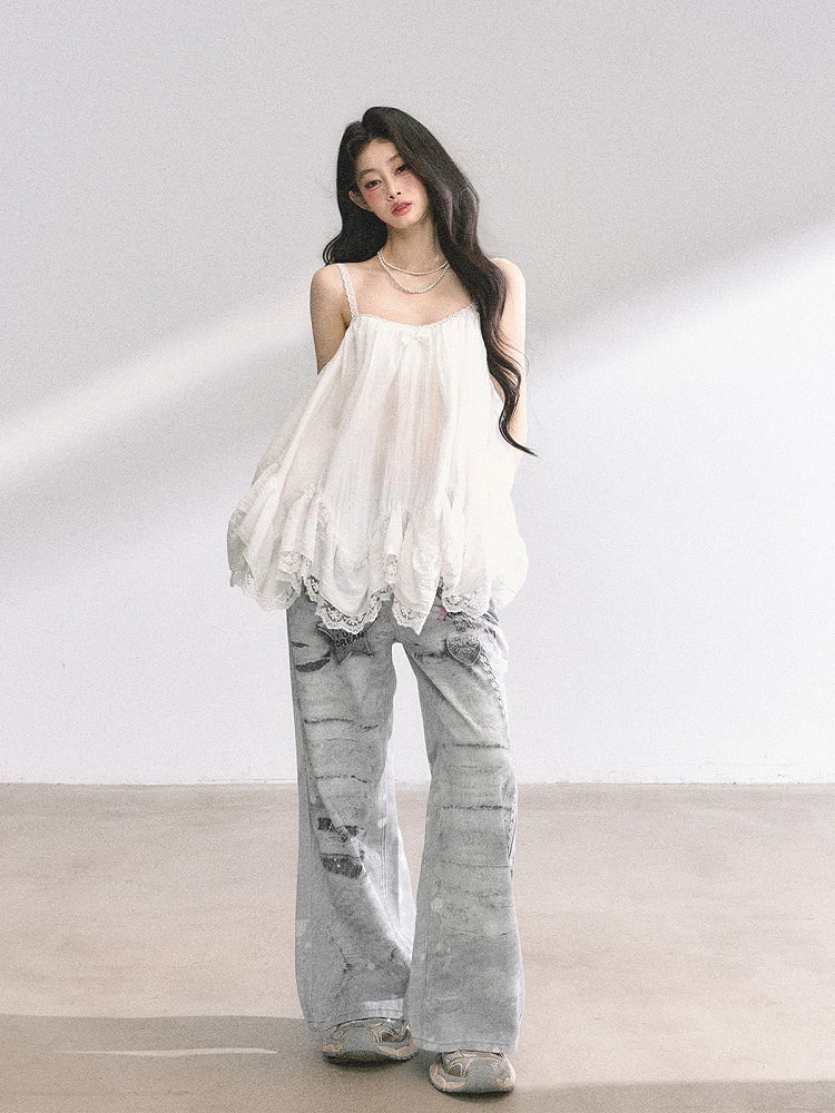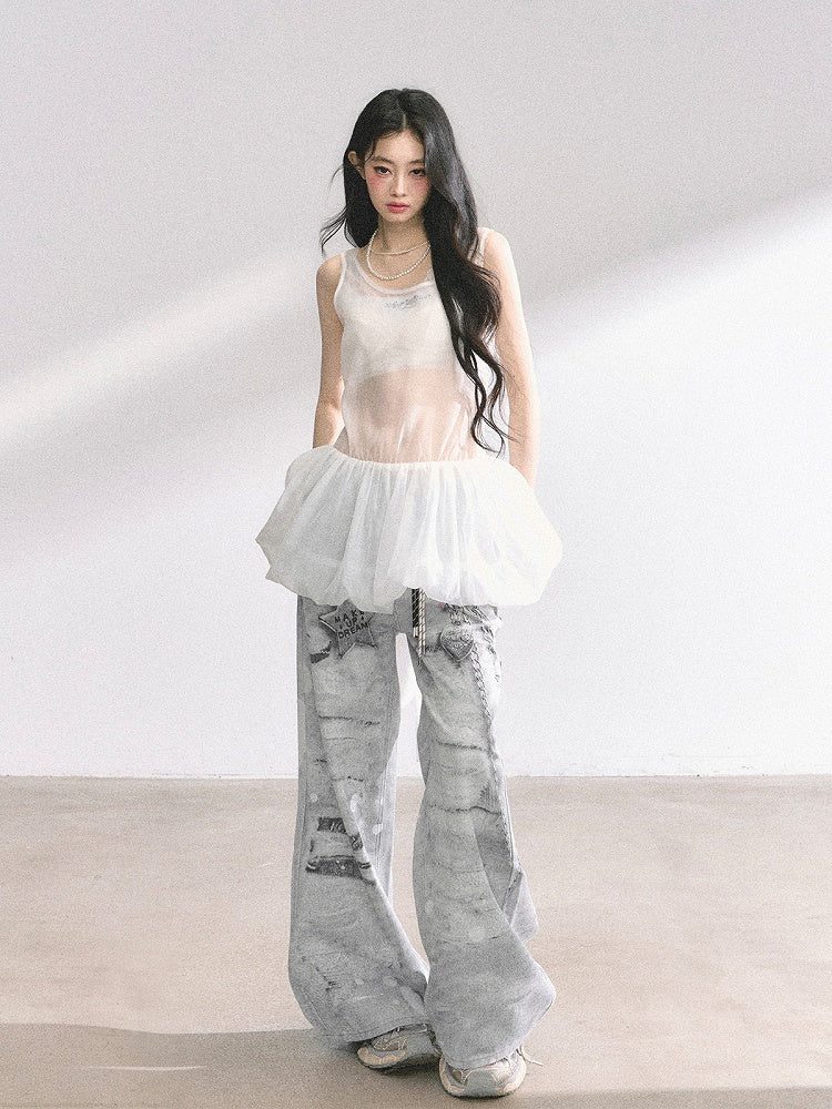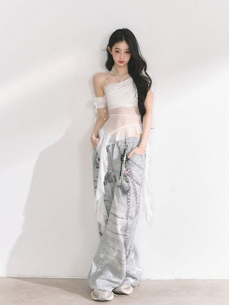 Hellgraue Jeans mit weitem Bein und niedriger Taille und Kettenmuster im Used-Look