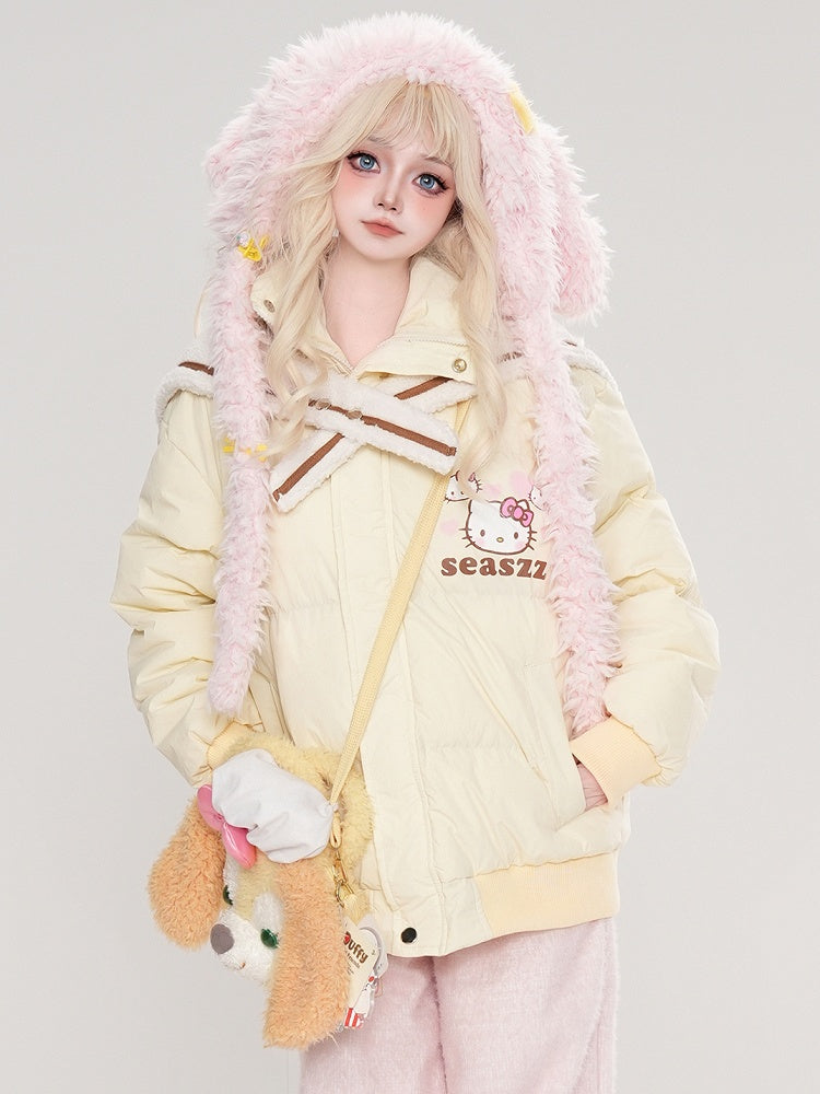 Diese bezaubernde hellgelbe Jacke mit verspieltem Kätzchen-Print und abnehmbarem Matrosenkragen hält Sie dank des dicken Materials den ganzen Tag warm und sieht stylisch aus. Perfekt, um jedem Outfit einen Hauch von Niedlichkeit zu verleihen.