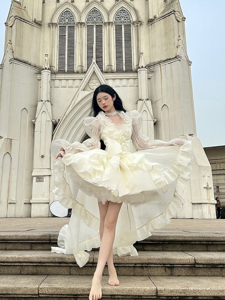 Hellgelbes, transparentes Oberteil mit langen Ärmeln und kaskadierendem Rüschensaum