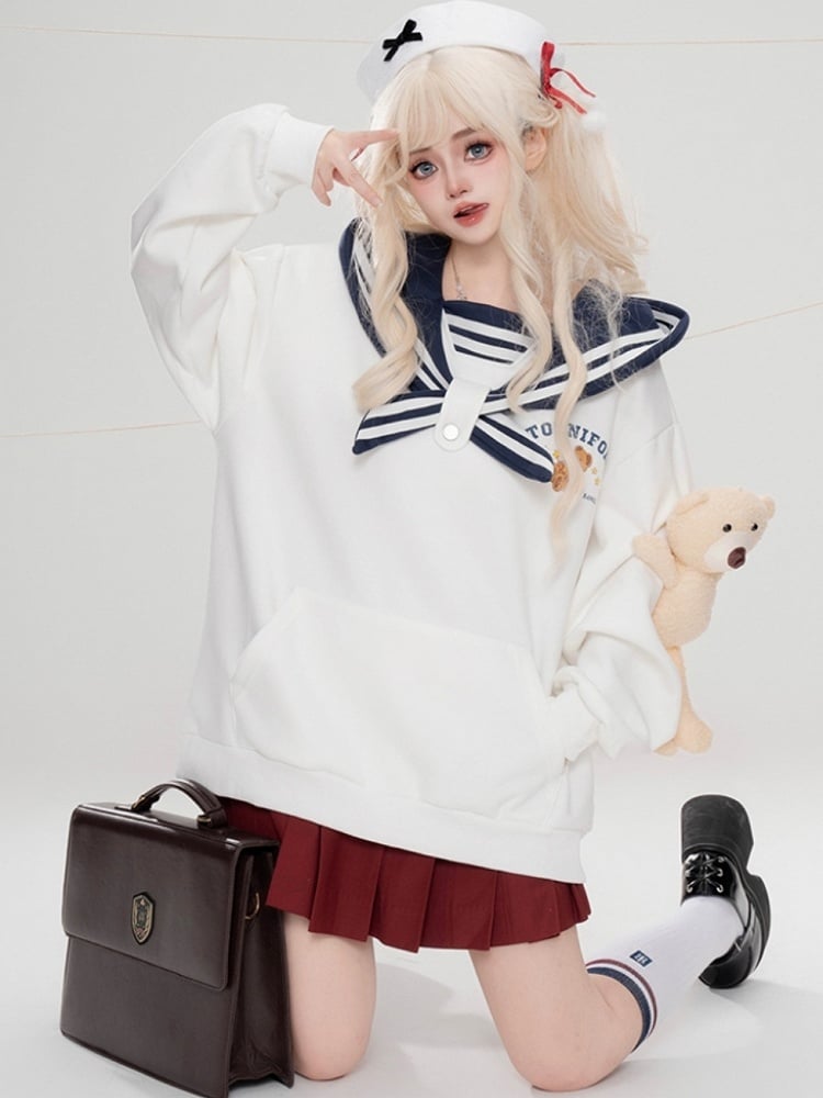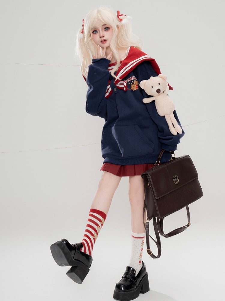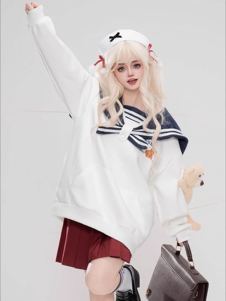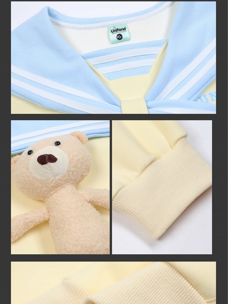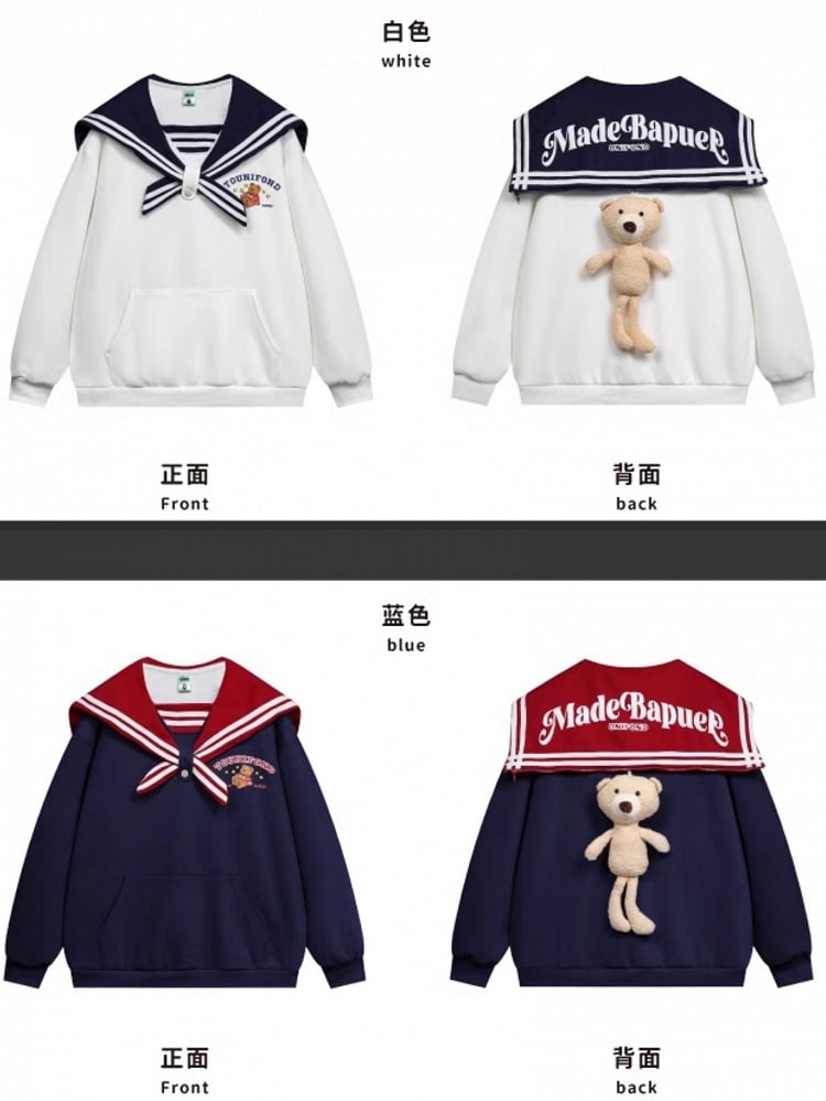 Dieser süße Kapuzenpullover mit Seemannskragen und Plüschbär ist ein Muss für alle, die süße und gemütliche Mode lieben. Die hellgelben, weißen und marineblauen Farben verleihen einen Hauch von Süße, während der Plüschbär ein bezauberndes Element hinzufügt. Bleiben Sie warm und stilvoll mit diesem schönen Hoodie.