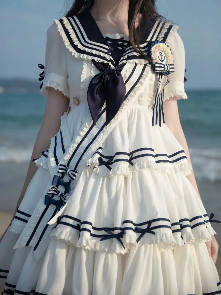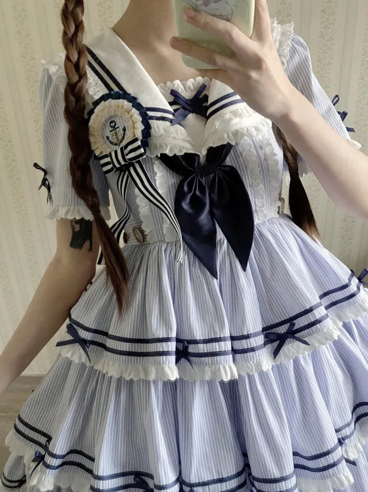 Blau-weißes Old School Lolita Fashion Kleid mit Schleife und Details, JSK-Set