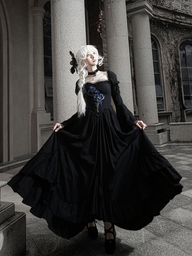 Iris Embroidery Black Elegant Lolita Gothic Dress with Drawstring Skirt