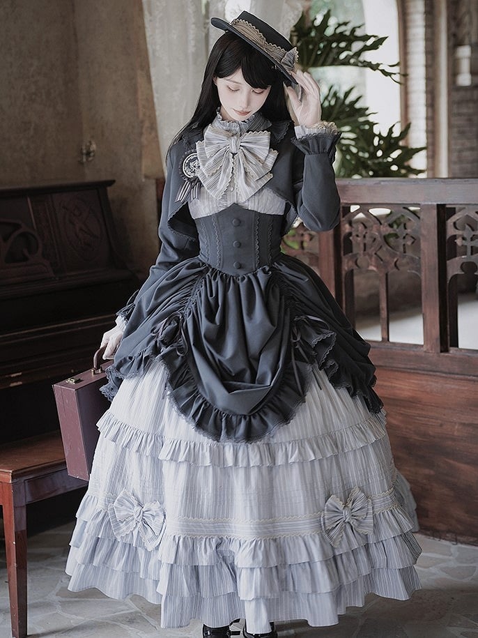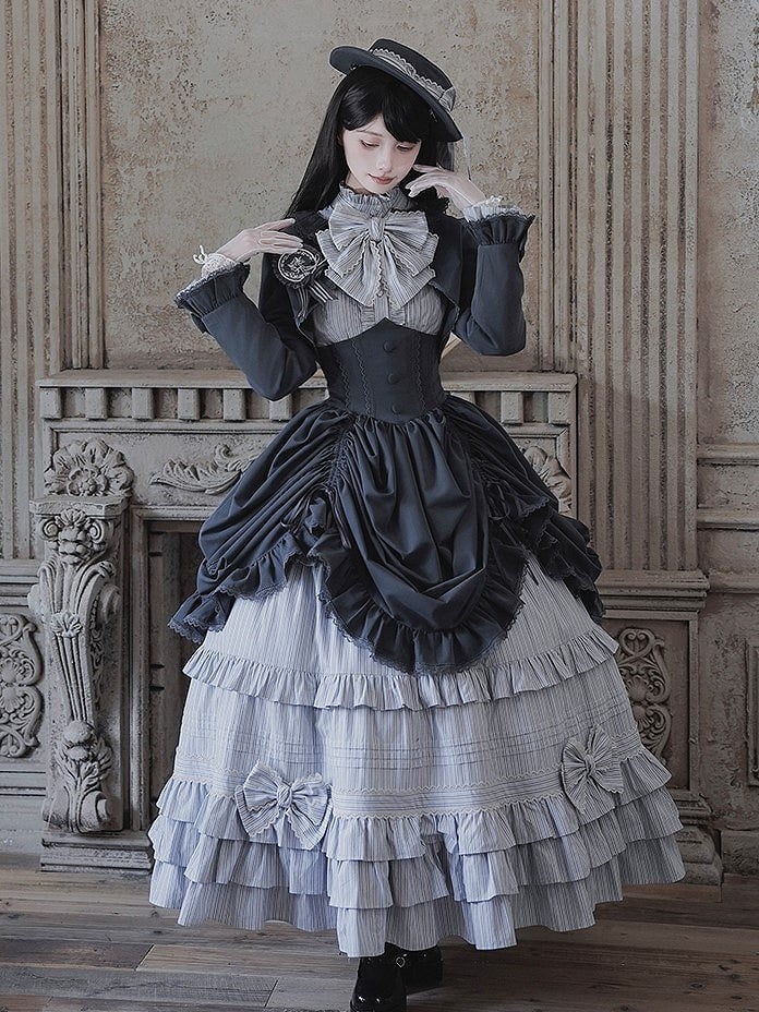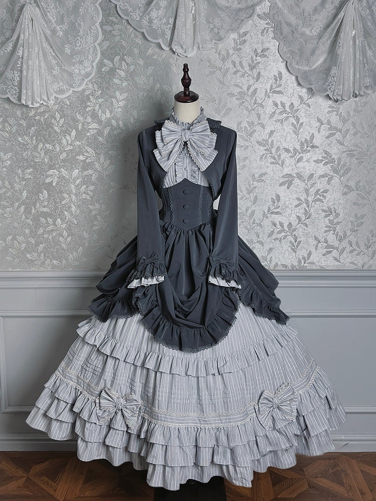 Gray Striped Elegant Classic Lolita Skirt + Striped Blouse + Bolero Top + Boned Skirt + Hat + Badge Full Set