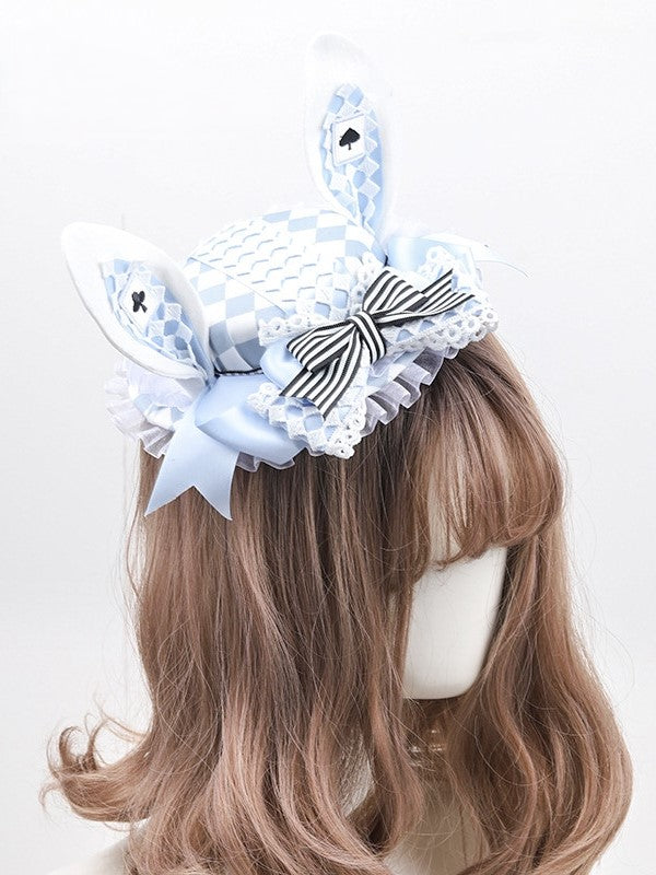 Blau-weiß karierte Lolita-Minimütze mit Hasenohren und gestreifter Schleife