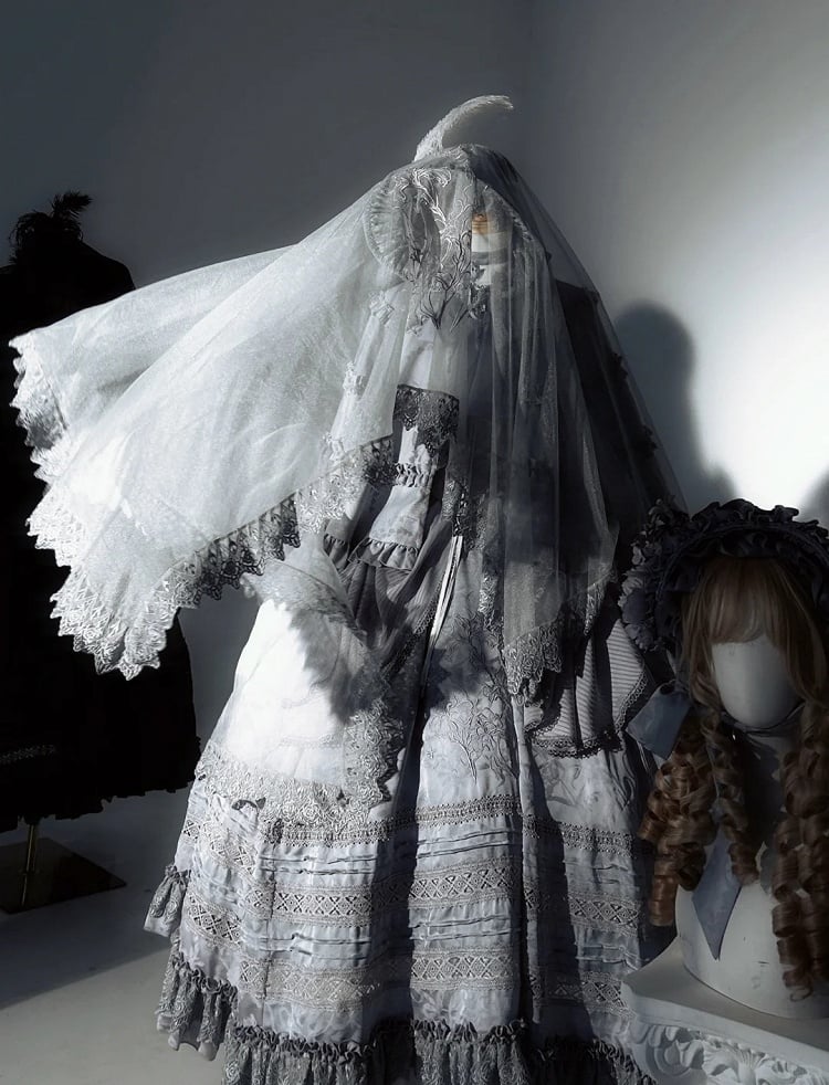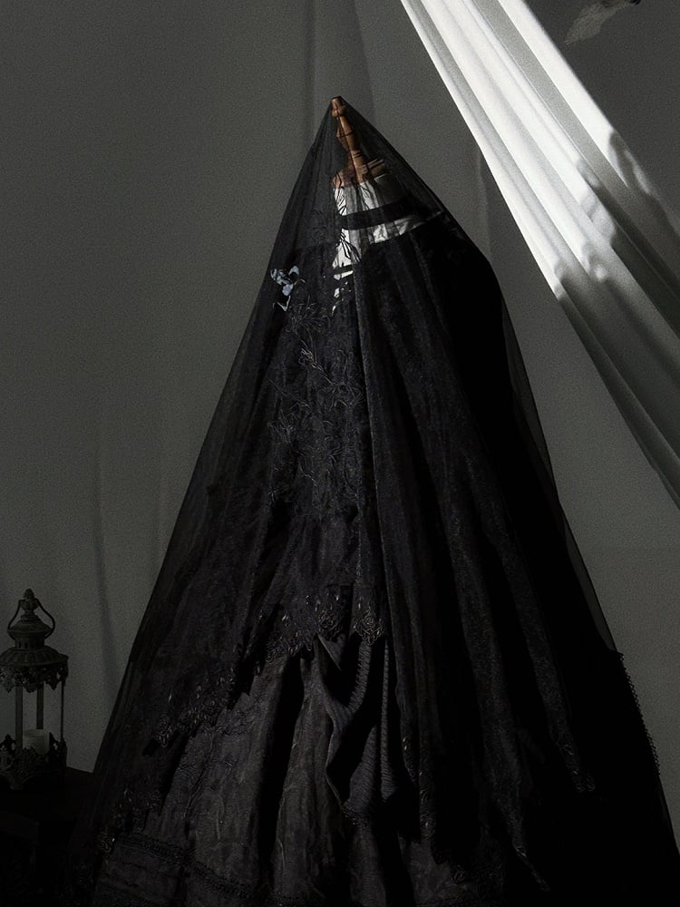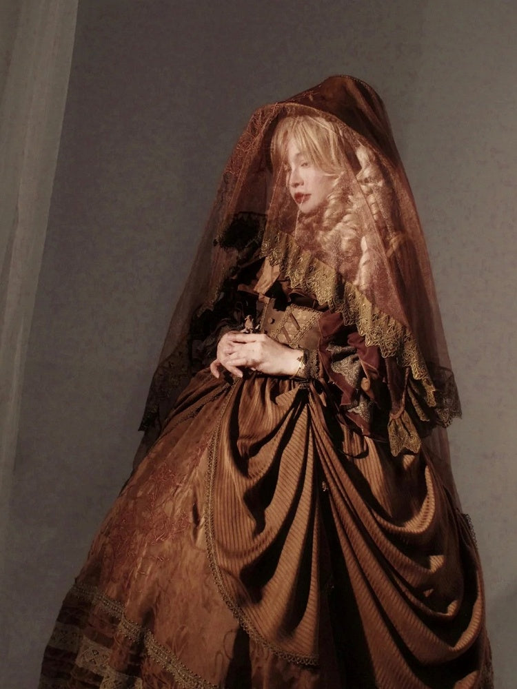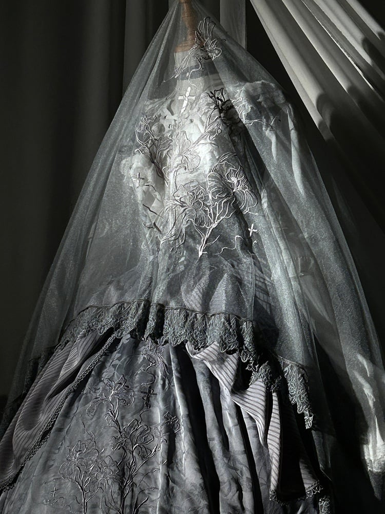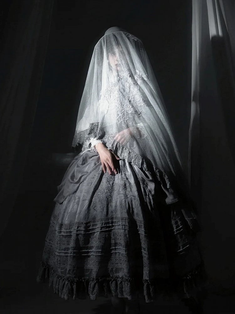 Schwarz/Grau/Brauner Lolita-Schleier mit Blumenstickerei und Spitzenbesatz