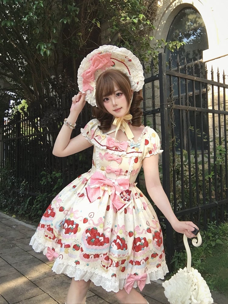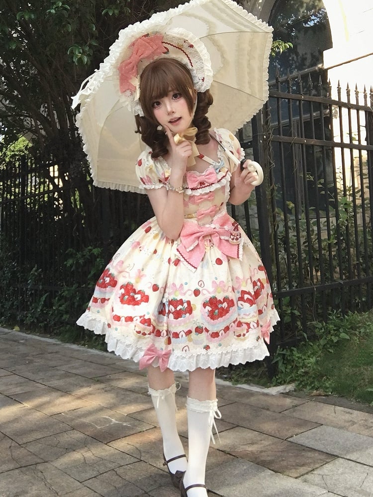 Erdbeerkuchen-Print Cremeweiß Süßes Lolita Einteiler Kurzarm Süßes Kleid