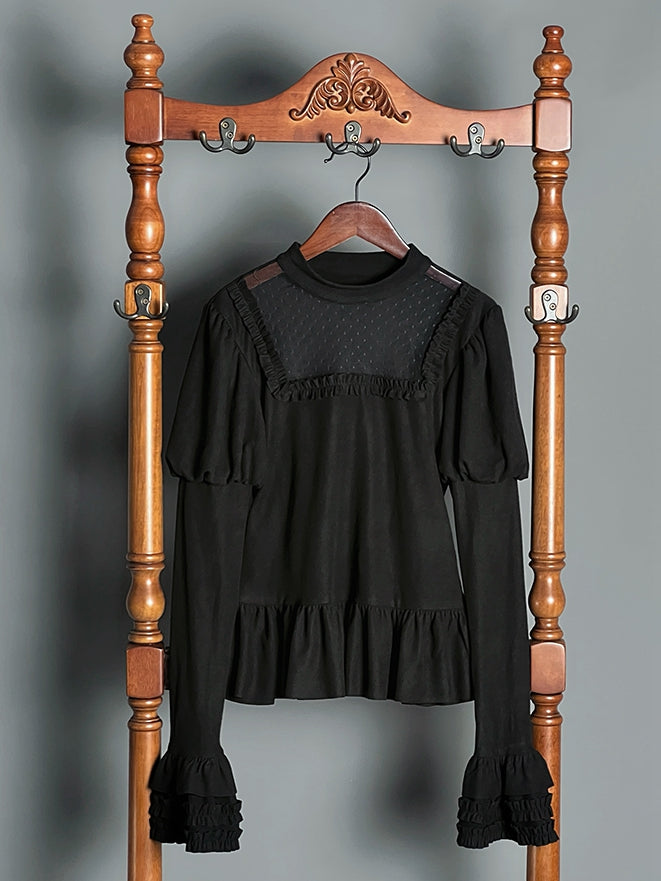 Schwarzes, langärmliges Oberteil mit Juliette-Ärmeln und Volantsaum