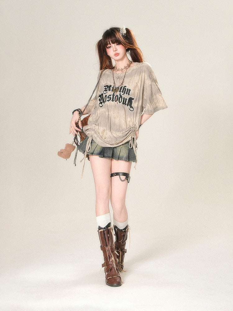 Lockeres T-Shirt mit apricotfarbenem Buchstabendruck und Kordelzug in der Taille und Löchern im Used-Look
