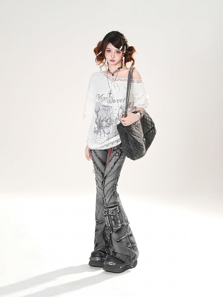 Lockeres, asymmetrisches T-Shirt mit Spitzenbesatz und Schmetterlingsdruck in Schwarz/Weiß