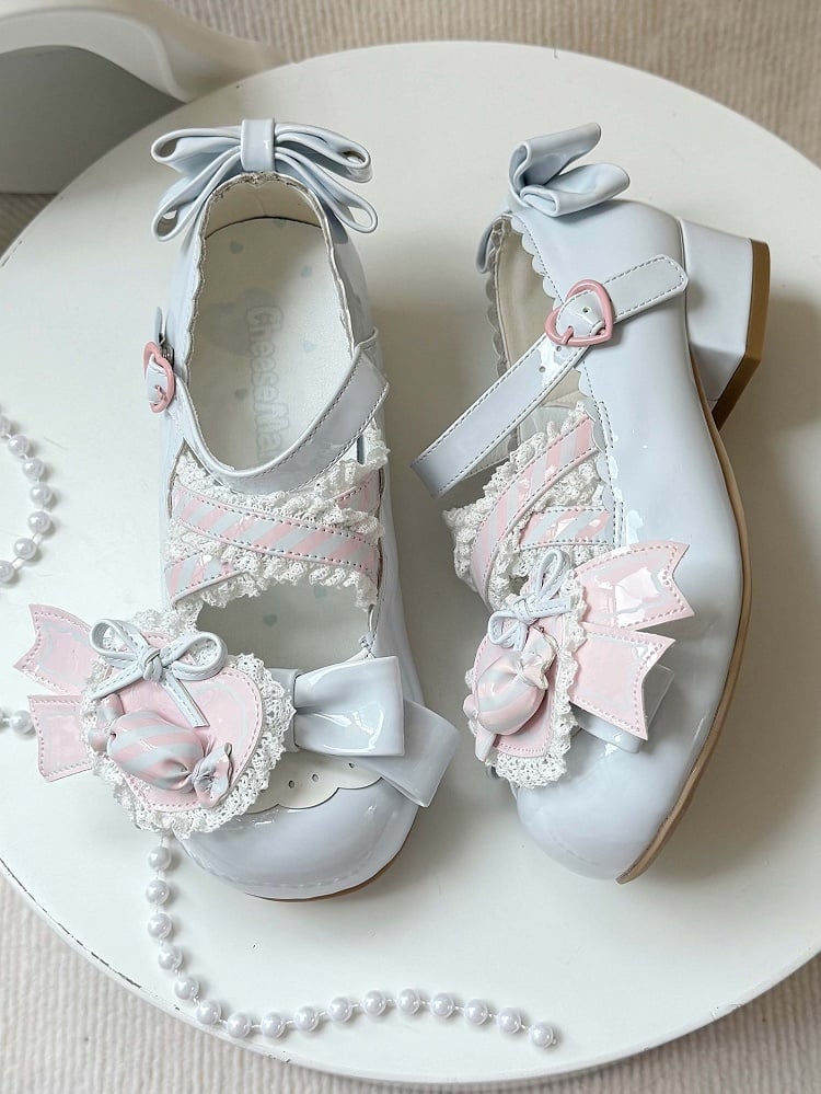 - Low Heels Pink mit Clip Style Lolita Sweet A Candy-Decorated Heart Shoe Bow Blue