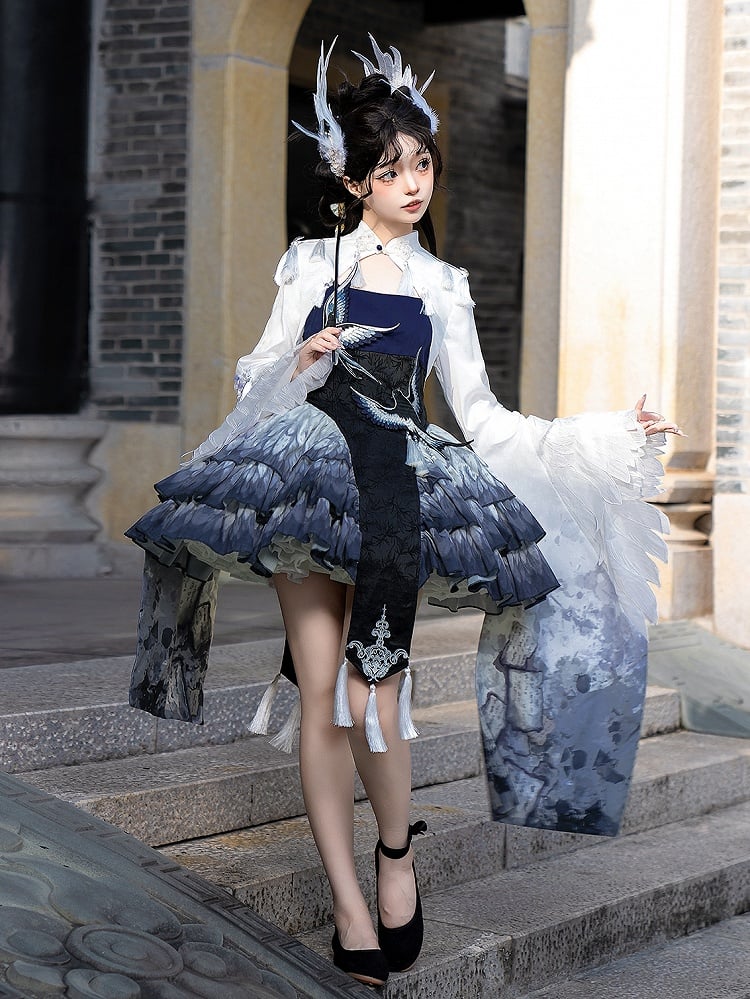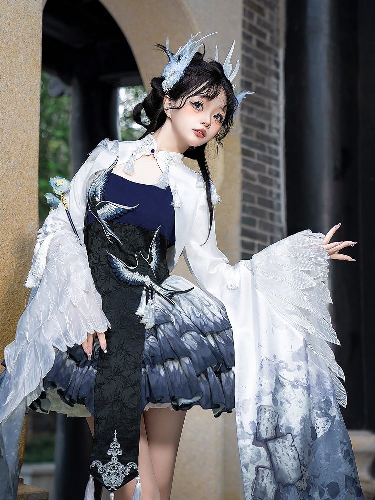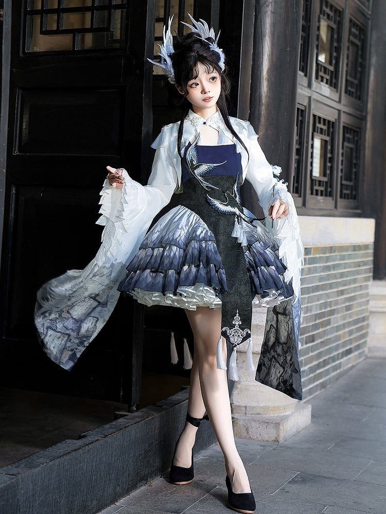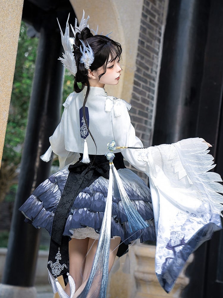 Dieses exquisite Lolita-Kleid mit Elster-Applikationen und Stufenrock ist mit zarten Elster-Applikationen verziert und verfügt über ein Stufenrock-Design, das jedem Outfit einen Hauch von Niedlichkeit verleiht. Die weiten Ärmel und das kurze Oberteil schaffen eine schöne Silhouette, perfekt für einen verspielten und charmanten Look.