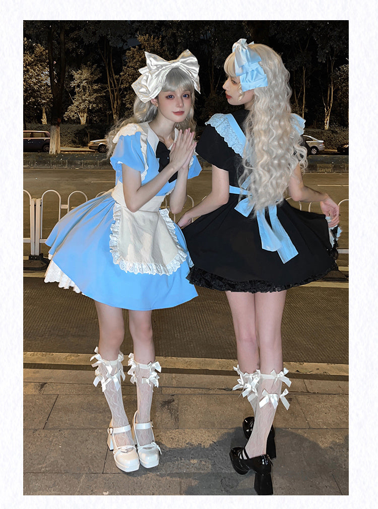 Blau-weißes Old School Lolita Fashion Kleid mit Schleife und Details, JSK-Set