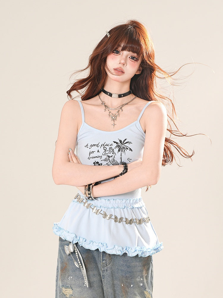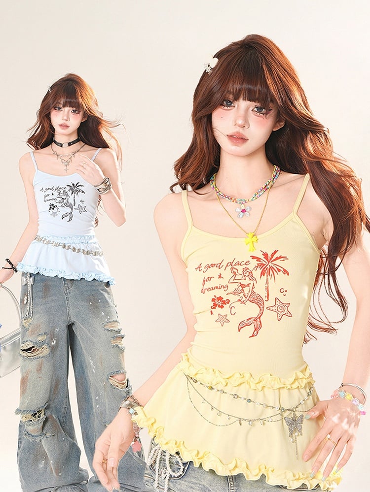 Gelb/blaues Camisole-Top mit Rüschenbesatz und Meerjungfrauen-Print