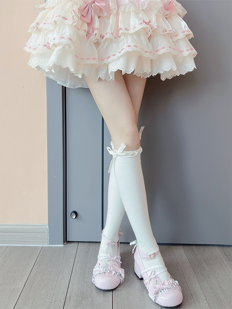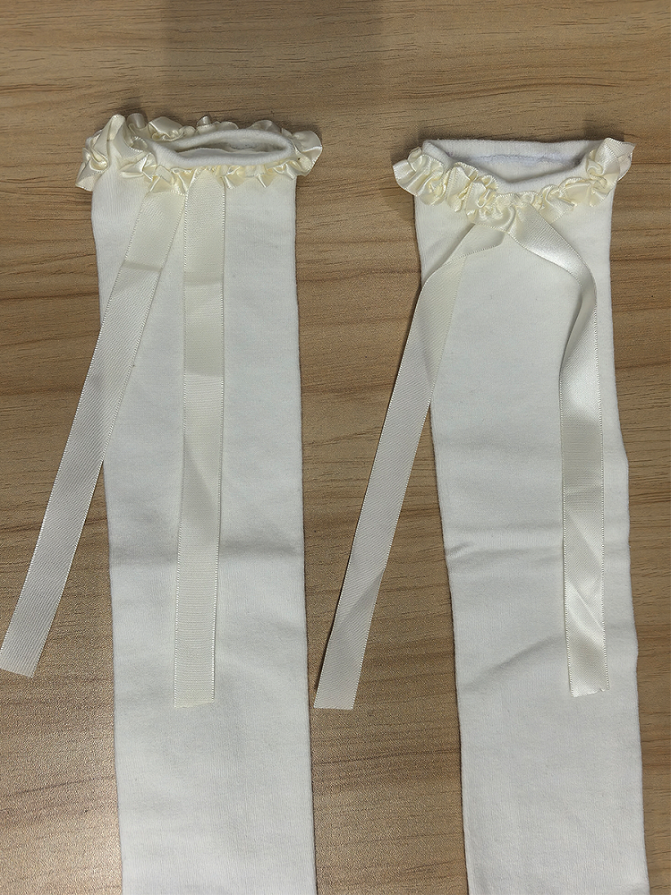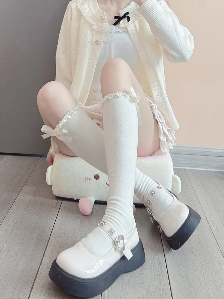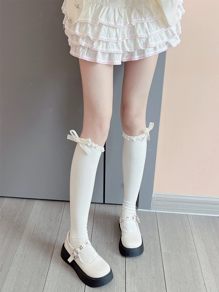 Milchweiße, süße Unterknee-Strümpfe mit Rüschenbündchen und Schleife
