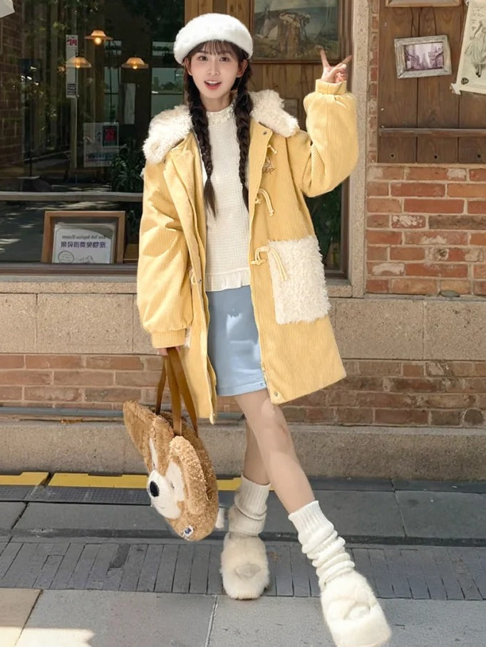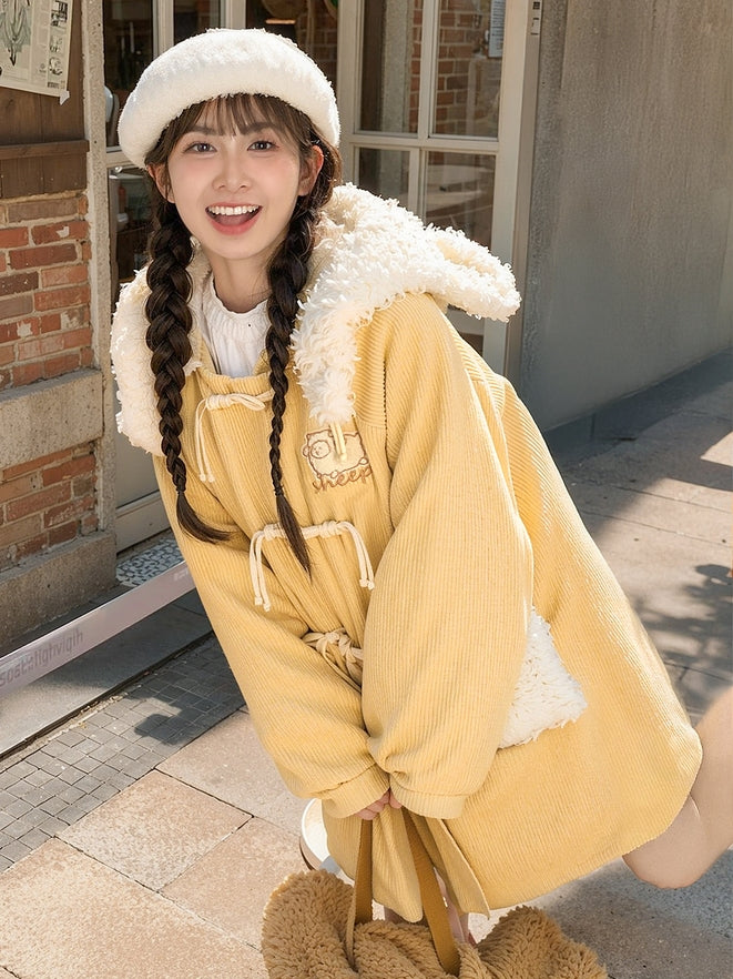 Milchgelber süßer Cord-Dufflecoat mit Lammkapuze