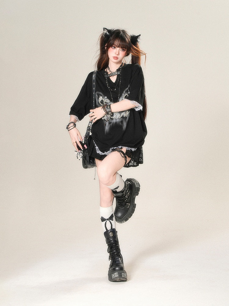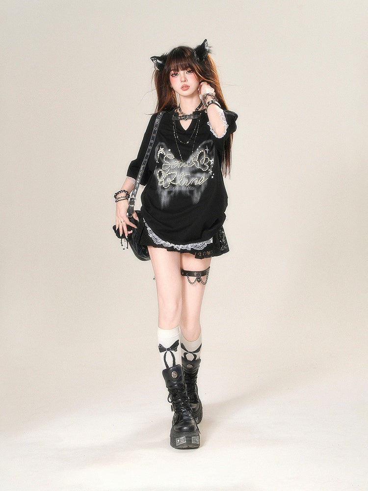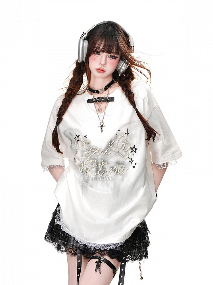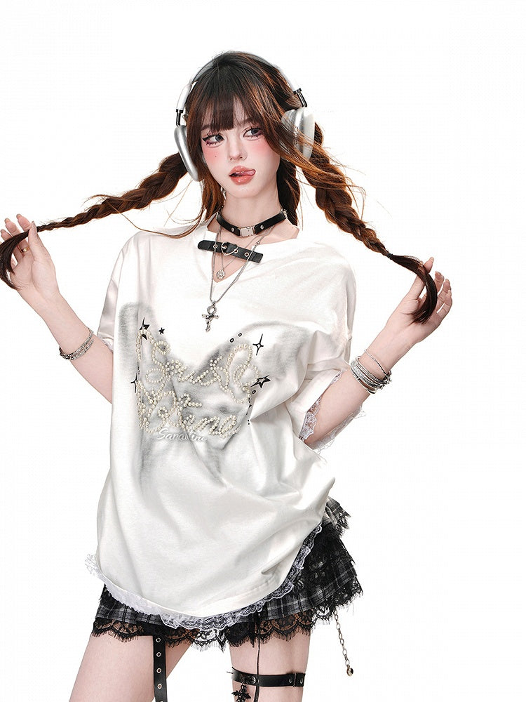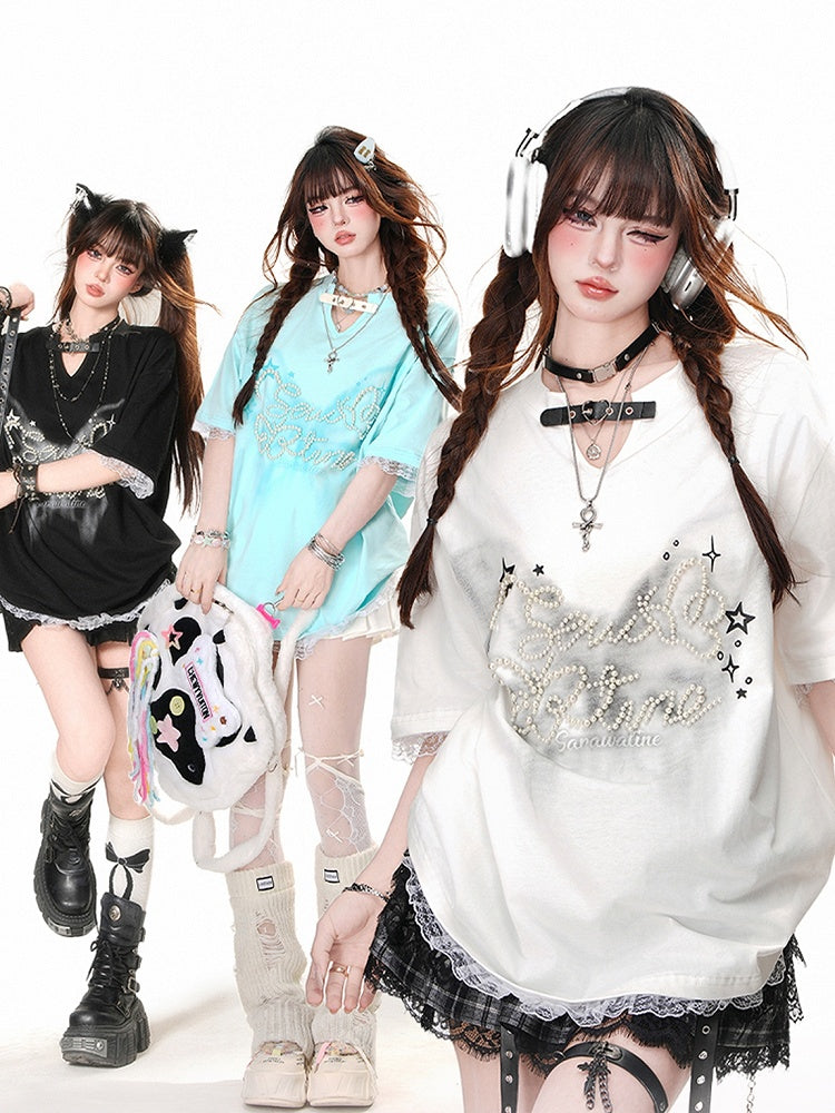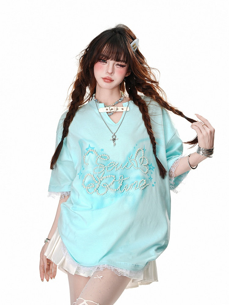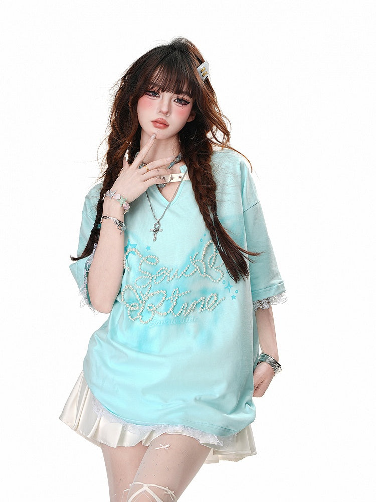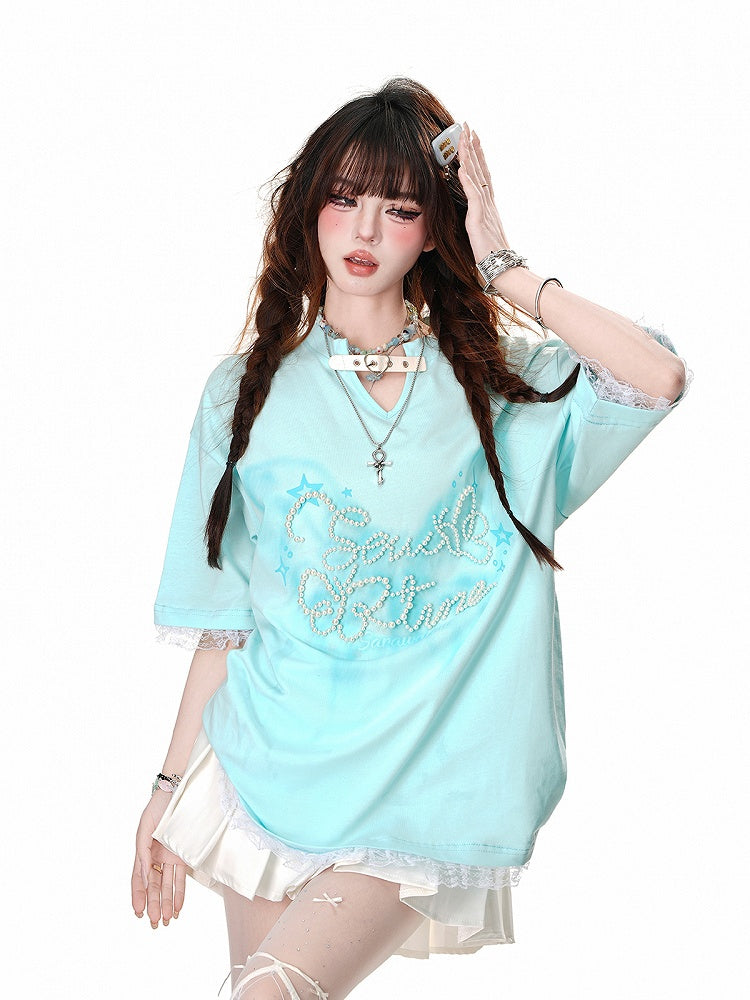 Mintgrünes/schwarzes/weißes T-Shirt mit V-Ausschnitt, Herzschnalle, Perlendetails und Spitzenbesatz