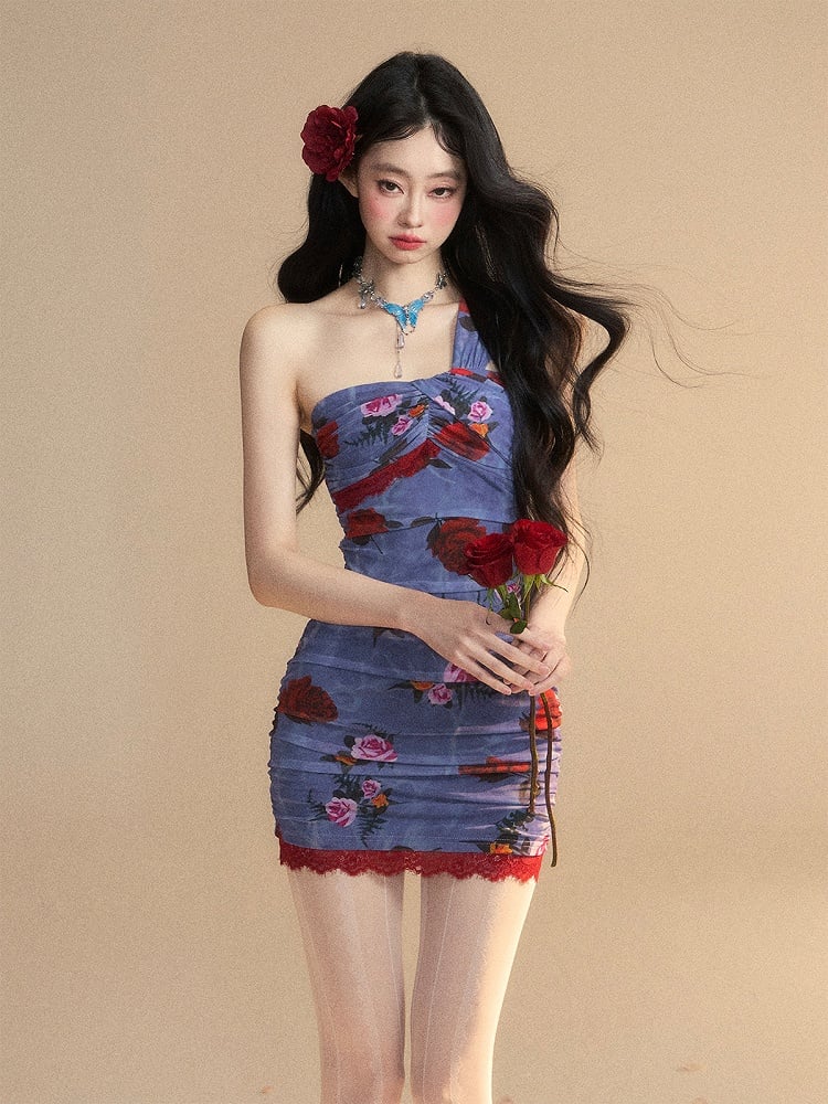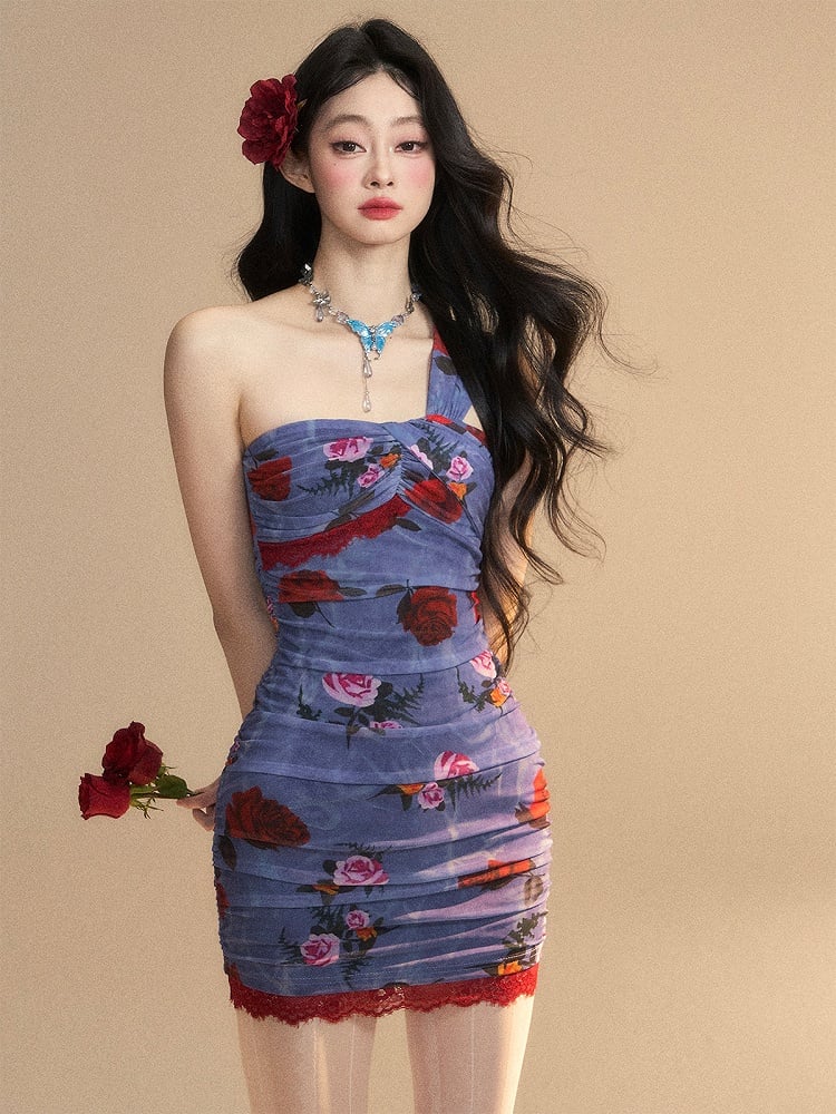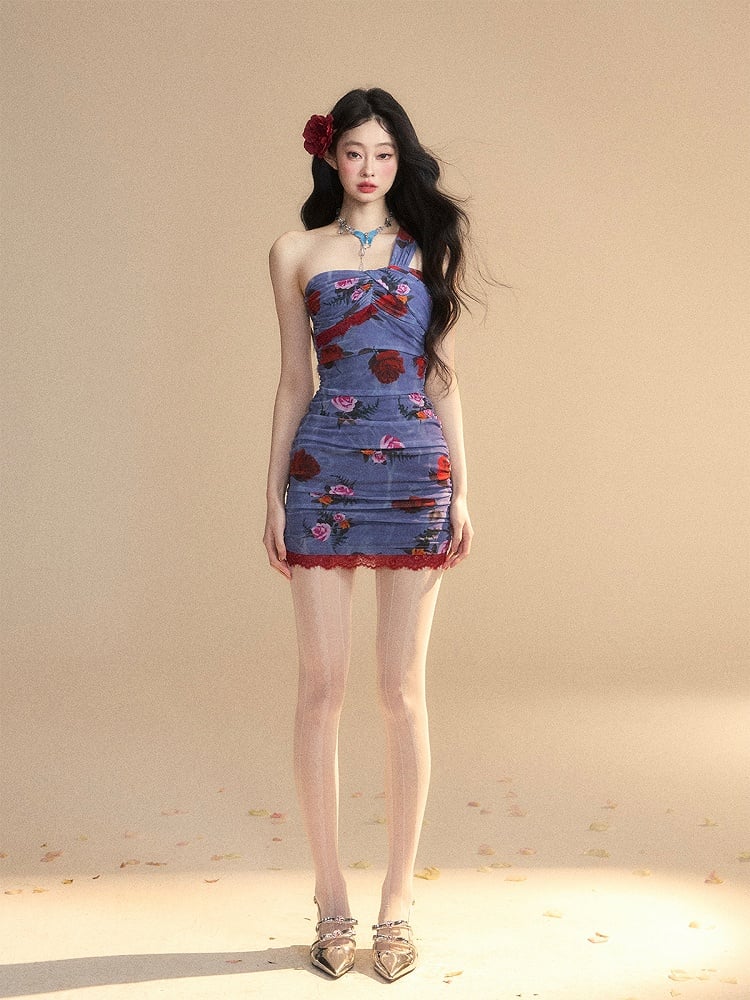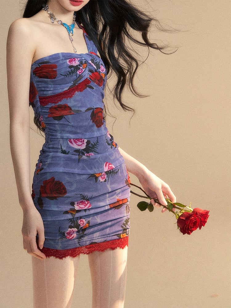 Monets geheimer Garten – Glamouröses Minikleid in Blau mit Blumenmuster und ärmellosem Ärmel