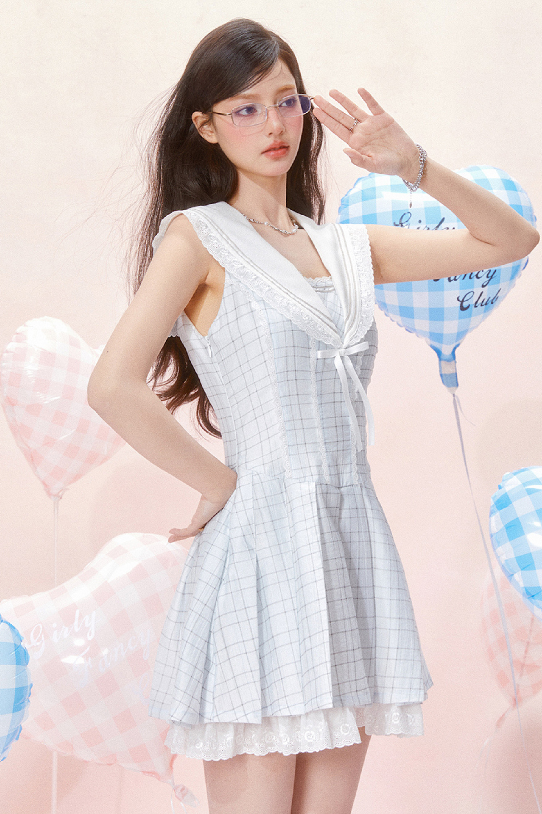 Blau-weißes Old School Lolita Fashion Kleid mit Schleife und Details, JSK-Set
