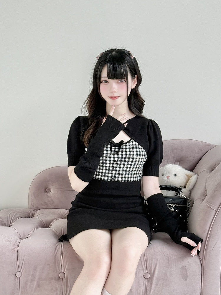 Jirai Kei – Schwarzes kariertes Strickkleid mit Ausschnitt und gedrehtem Ausschnitt