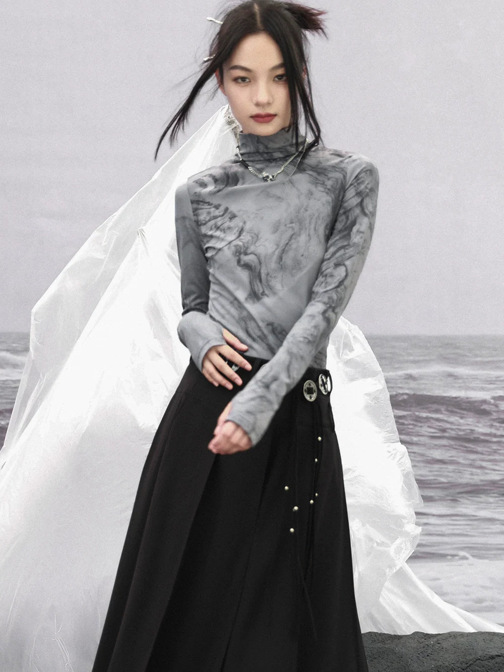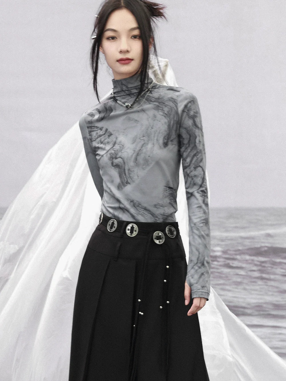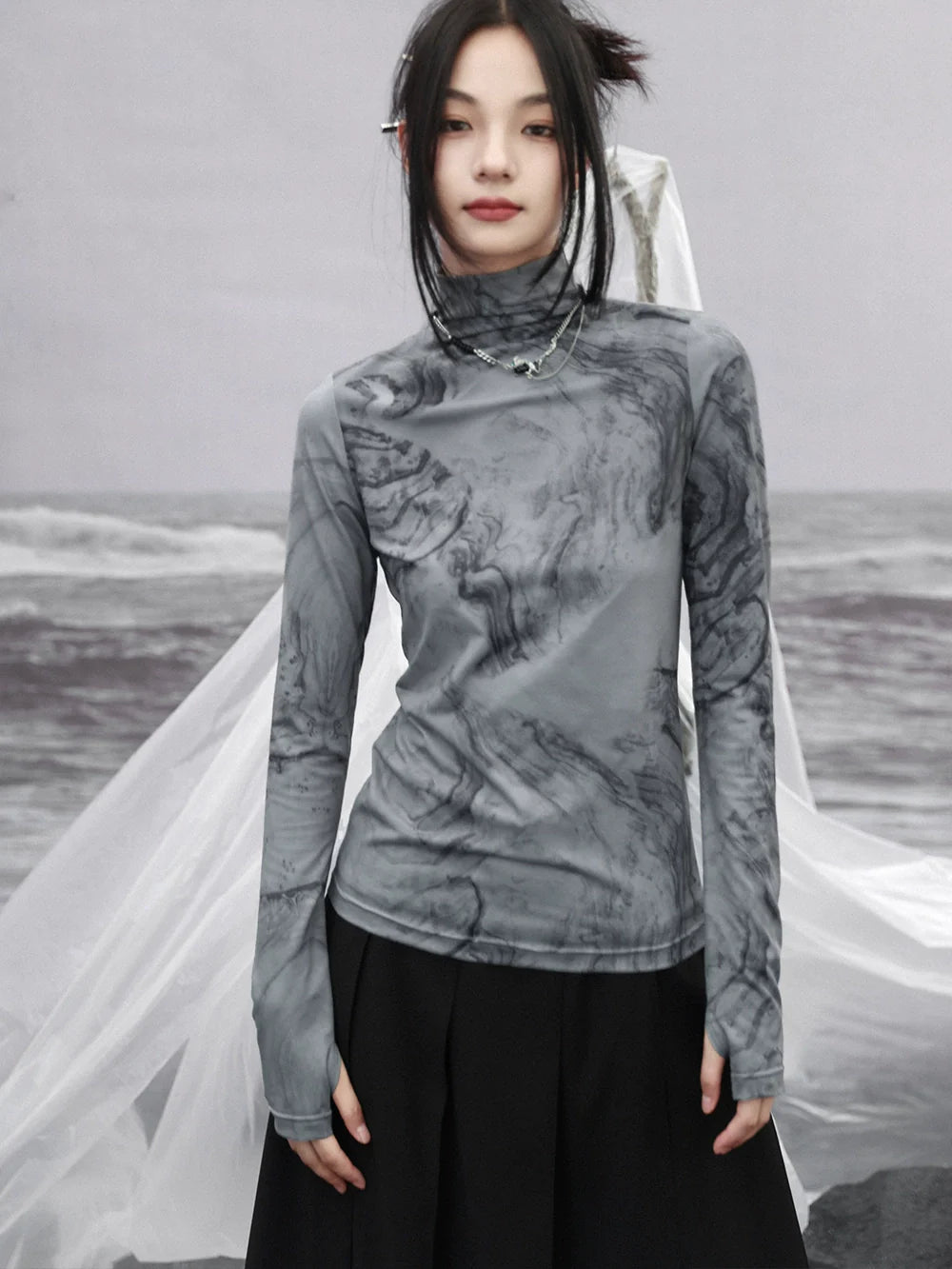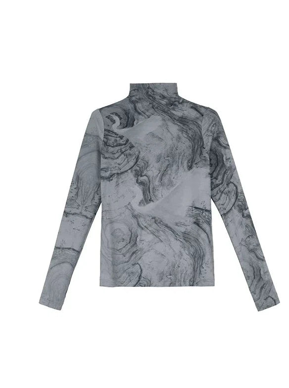 Dieses Slim-Fit-Top mit hohem Halsausschnitt besticht durch sein stilvolles dunkles Marmor-Design und verleiht jedem Outfit einen süßen und einzigartigen Look. Die schmale Passform sorgt für eine schmeichelhafte Silhouette und gibt Ihnen den ganzen Tag über Selbstvertrauen und Komfort. Veredeln Sie Ihren Style mit diesem Must-have-Top.