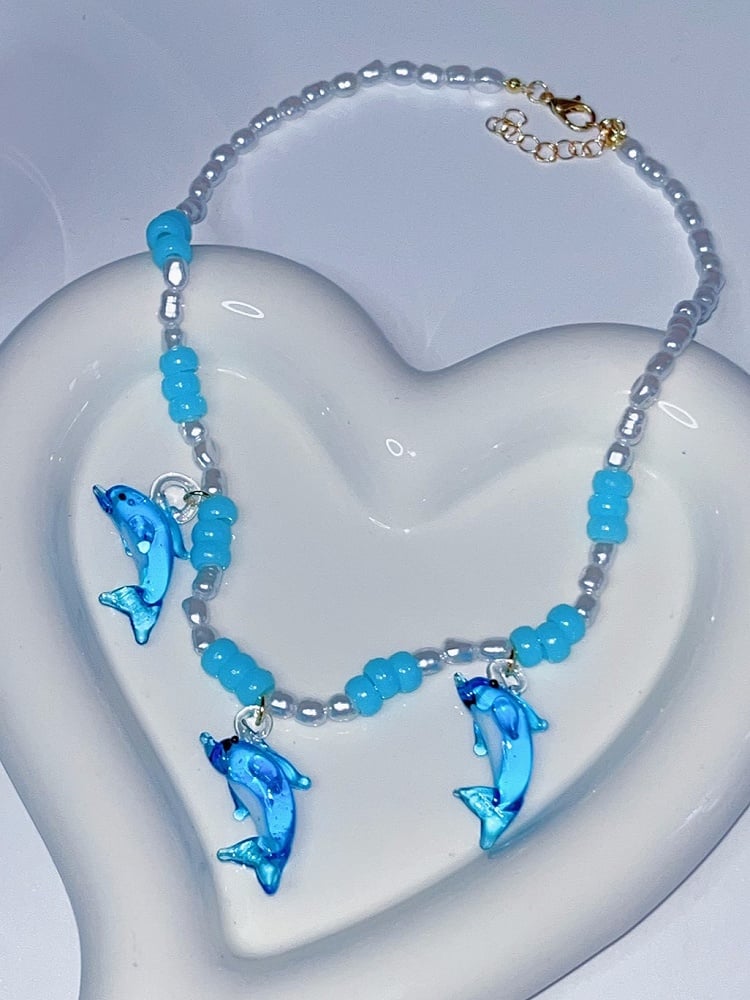 Blaue Y2K Delfin Anhänger Perlen Halskette