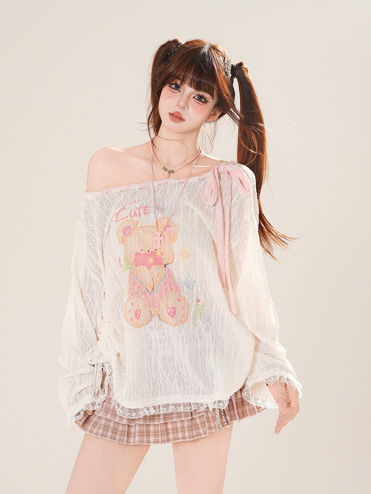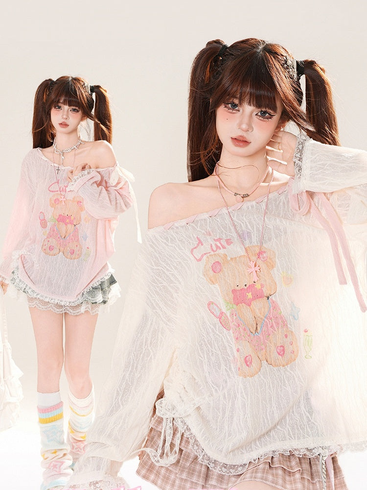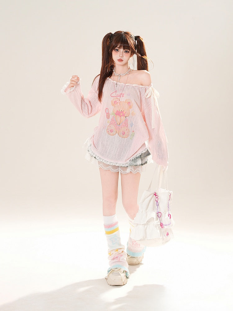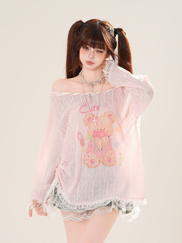 Ausschnitt-Überwurf, schulterfrei, entzückender Bärendruck, Rosa/Weiß, zum Selbstbinden