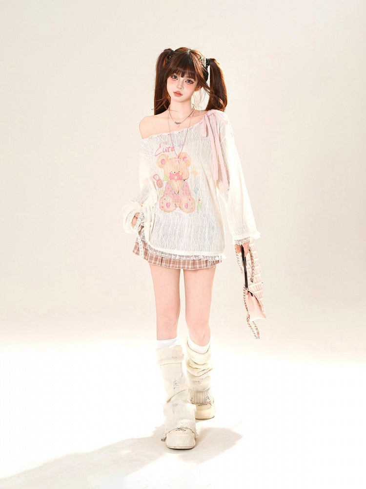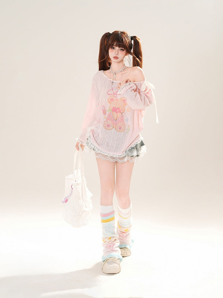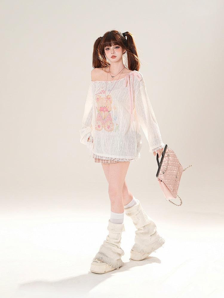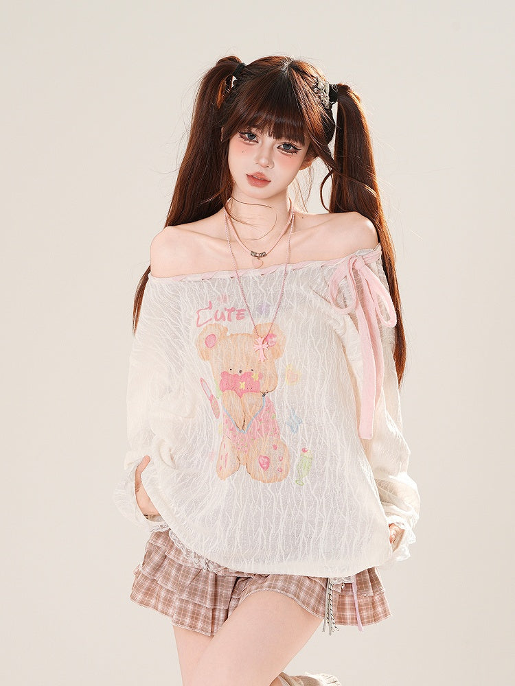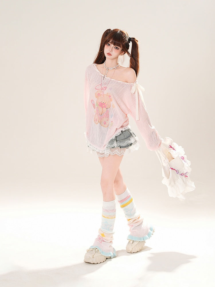 Ausschnitt-Überwurf, schulterfrei, entzückender Bärendruck, Rosa/Weiß, zum Selbstbinden