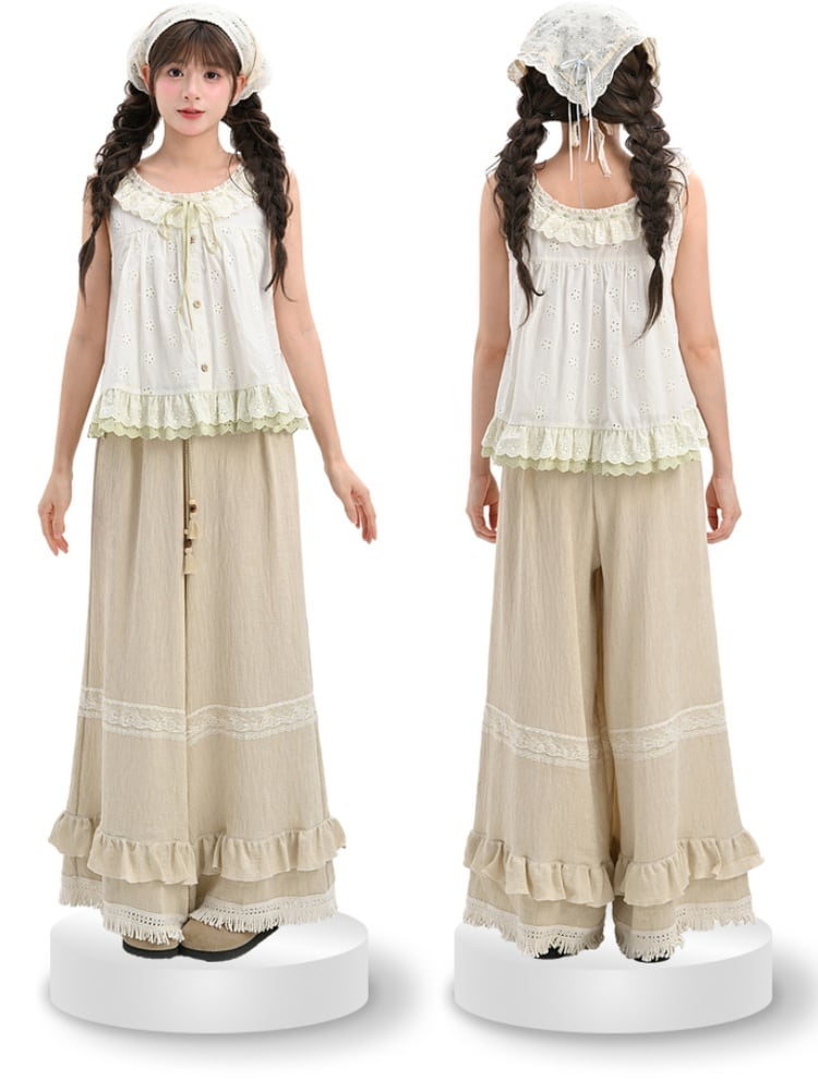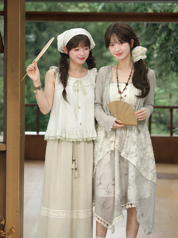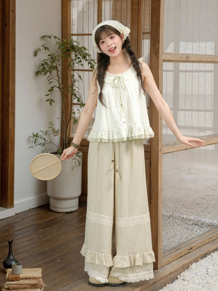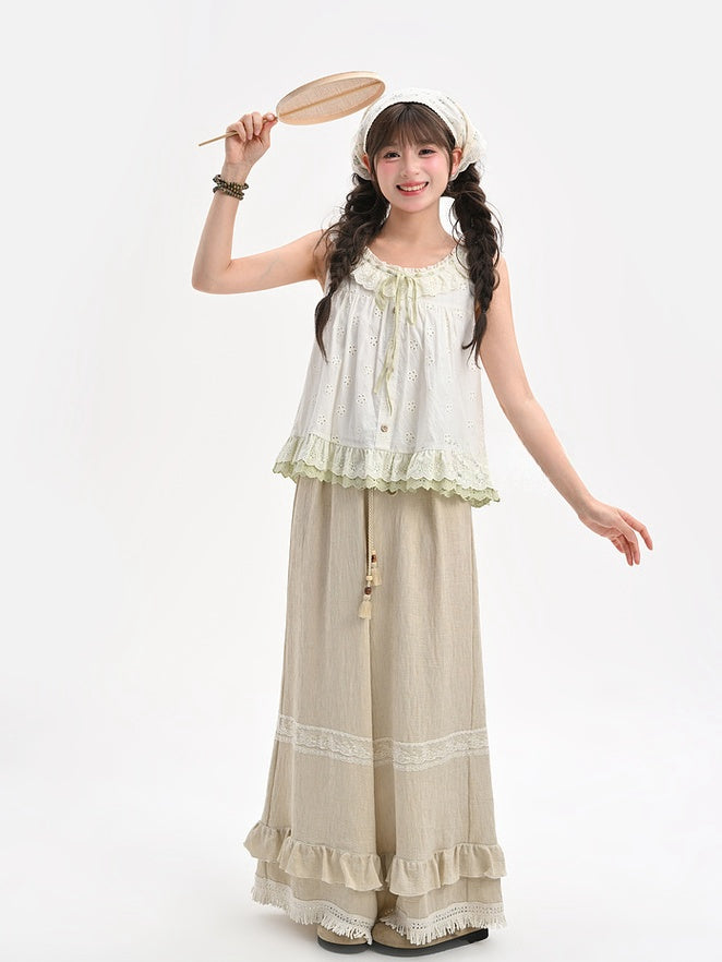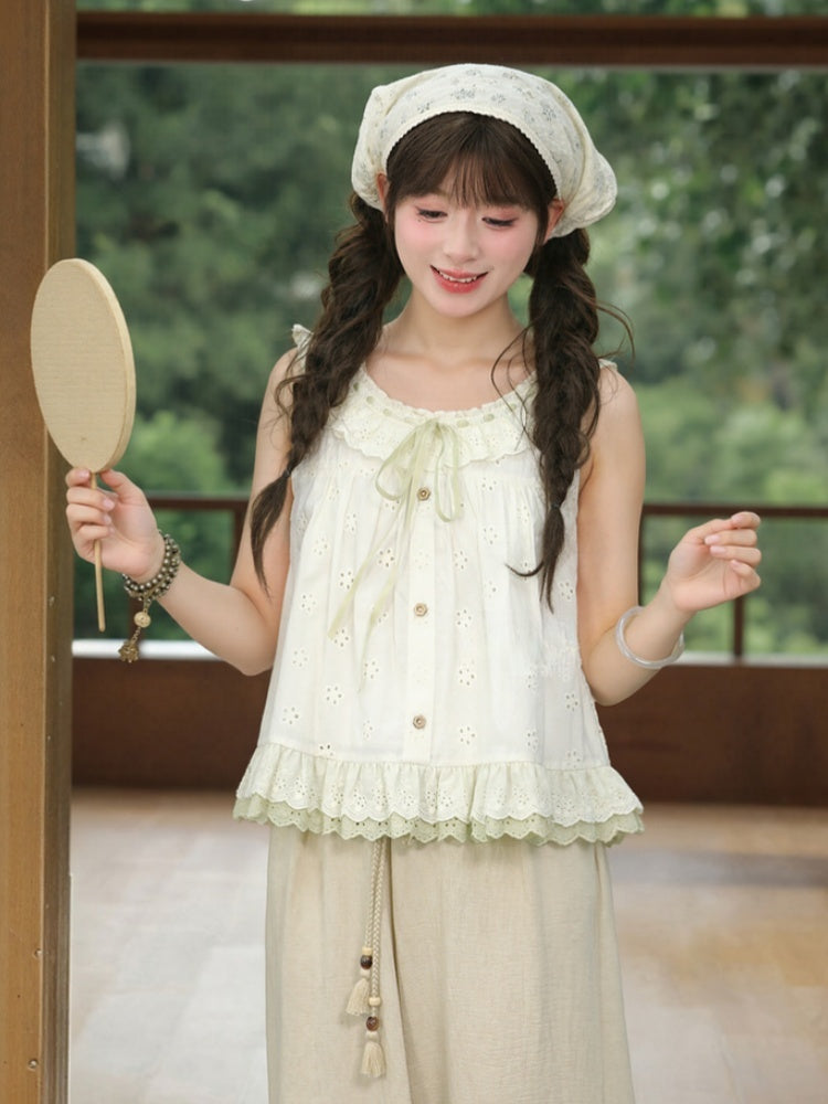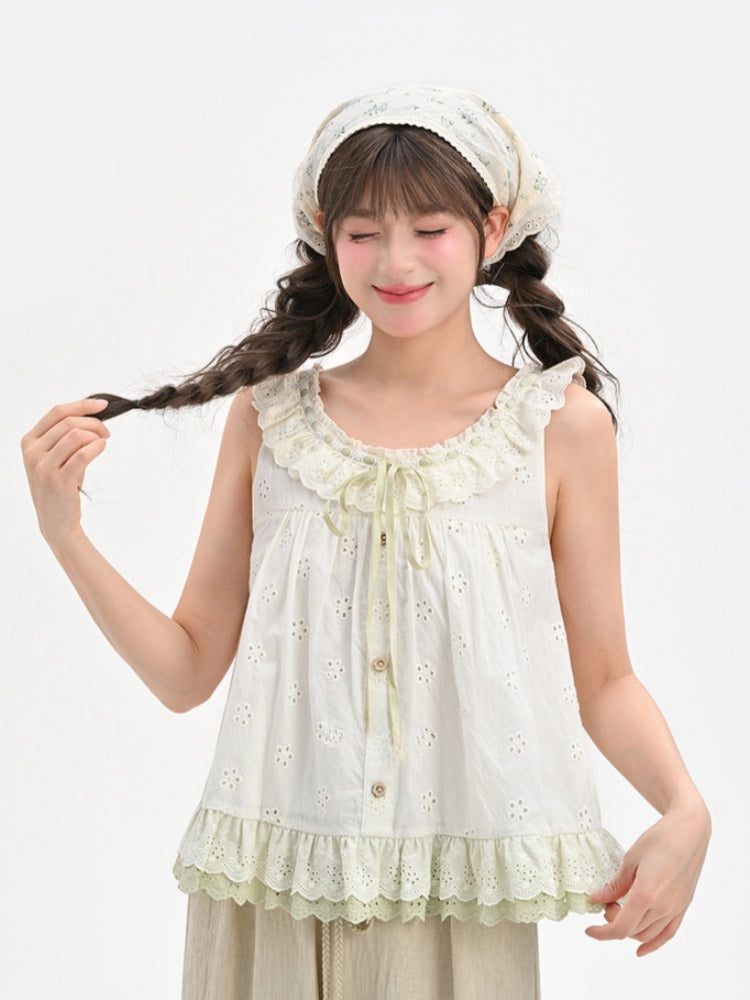 Grünes Cutton-Tanktop mit Flatterärmeln, gestuften Rüschen und selbstbindendem Riemen am Ausschnitt