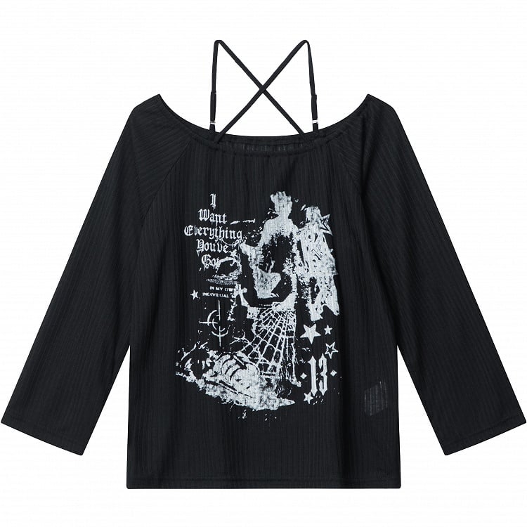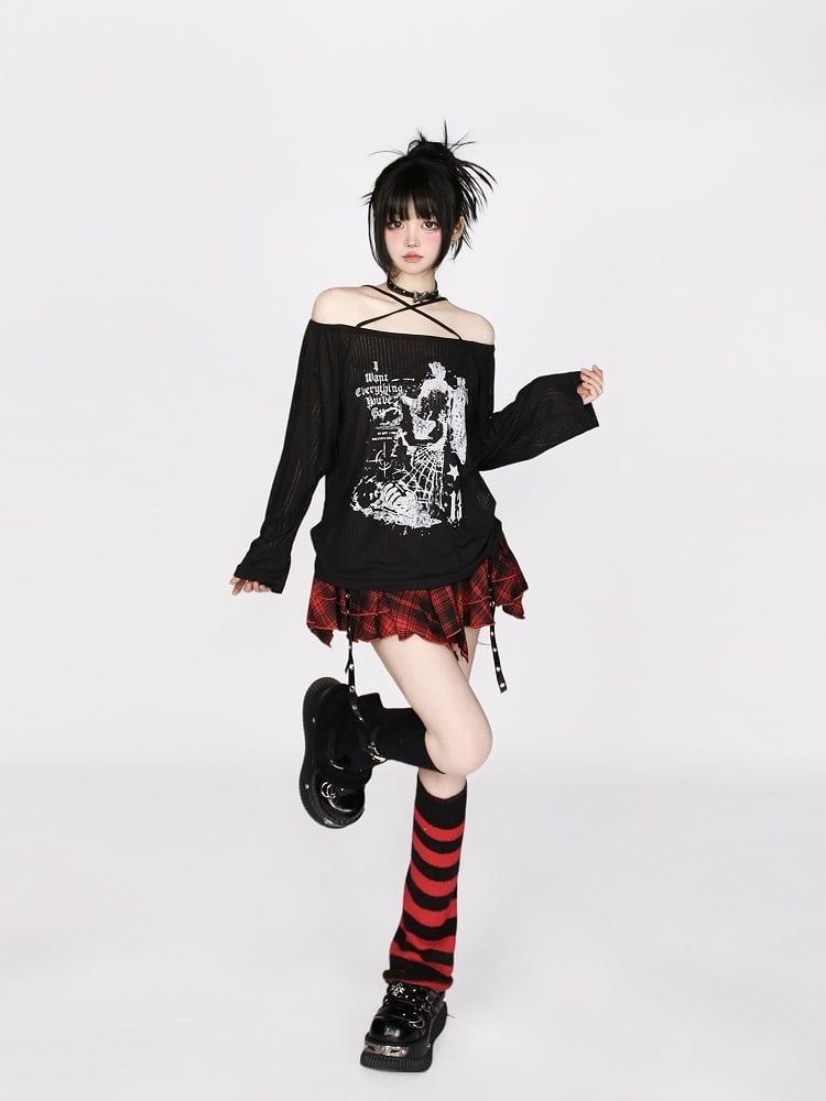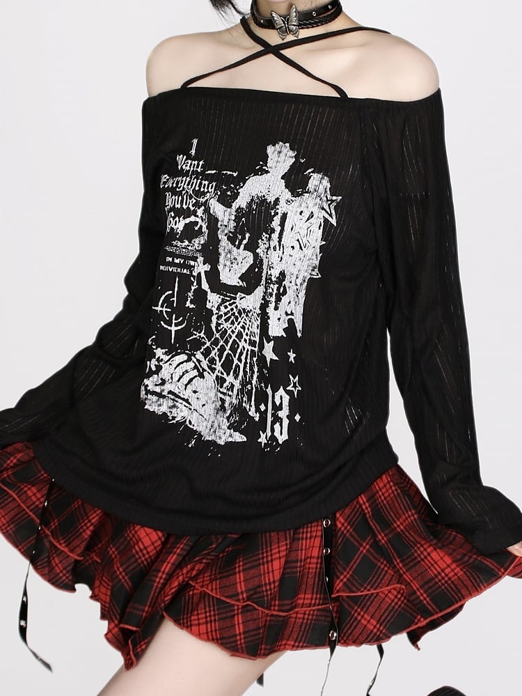 Schwarzes schulterfreies Stricktop mit überkreuztem Neckholder und Buchstabendruck