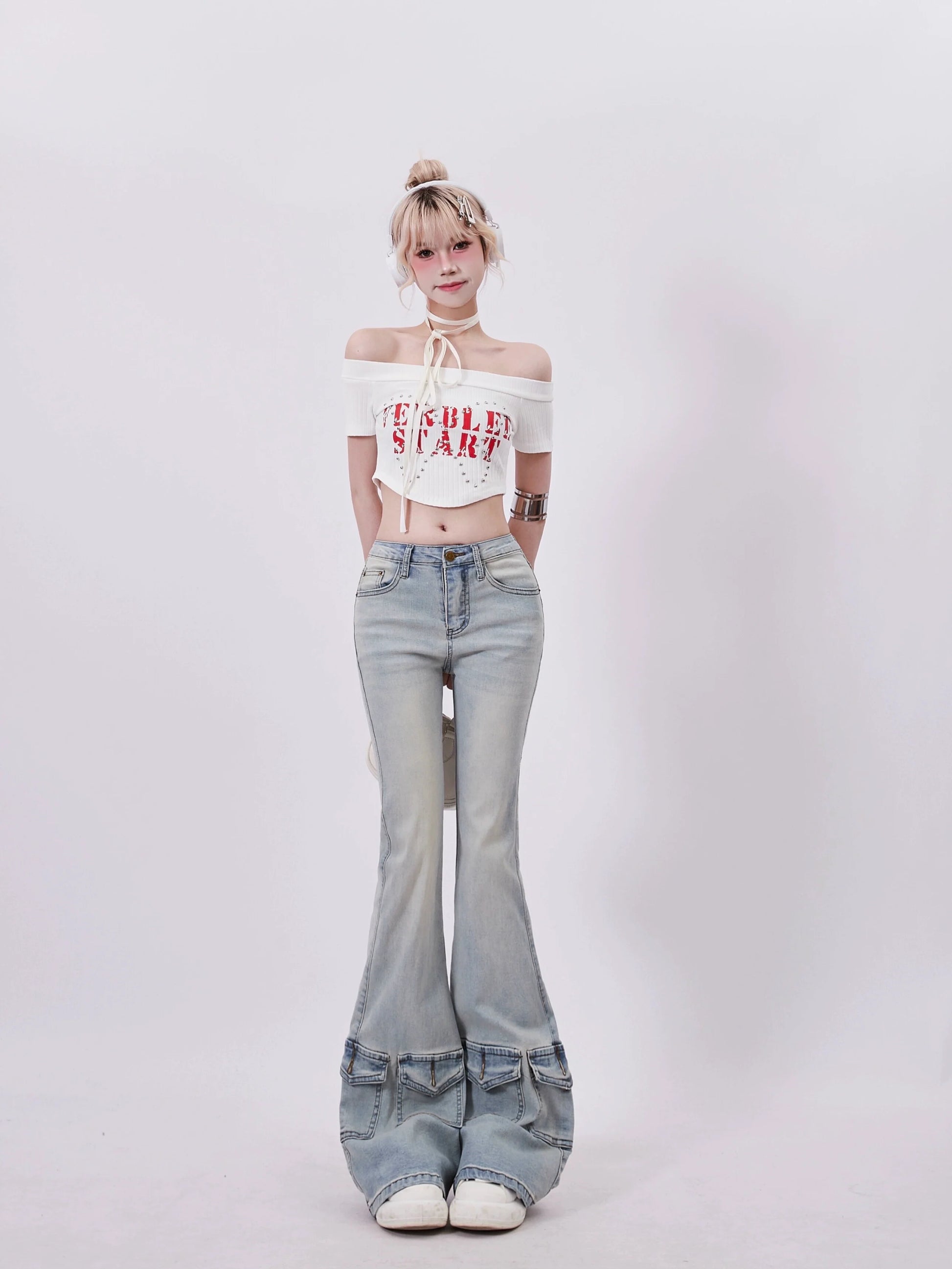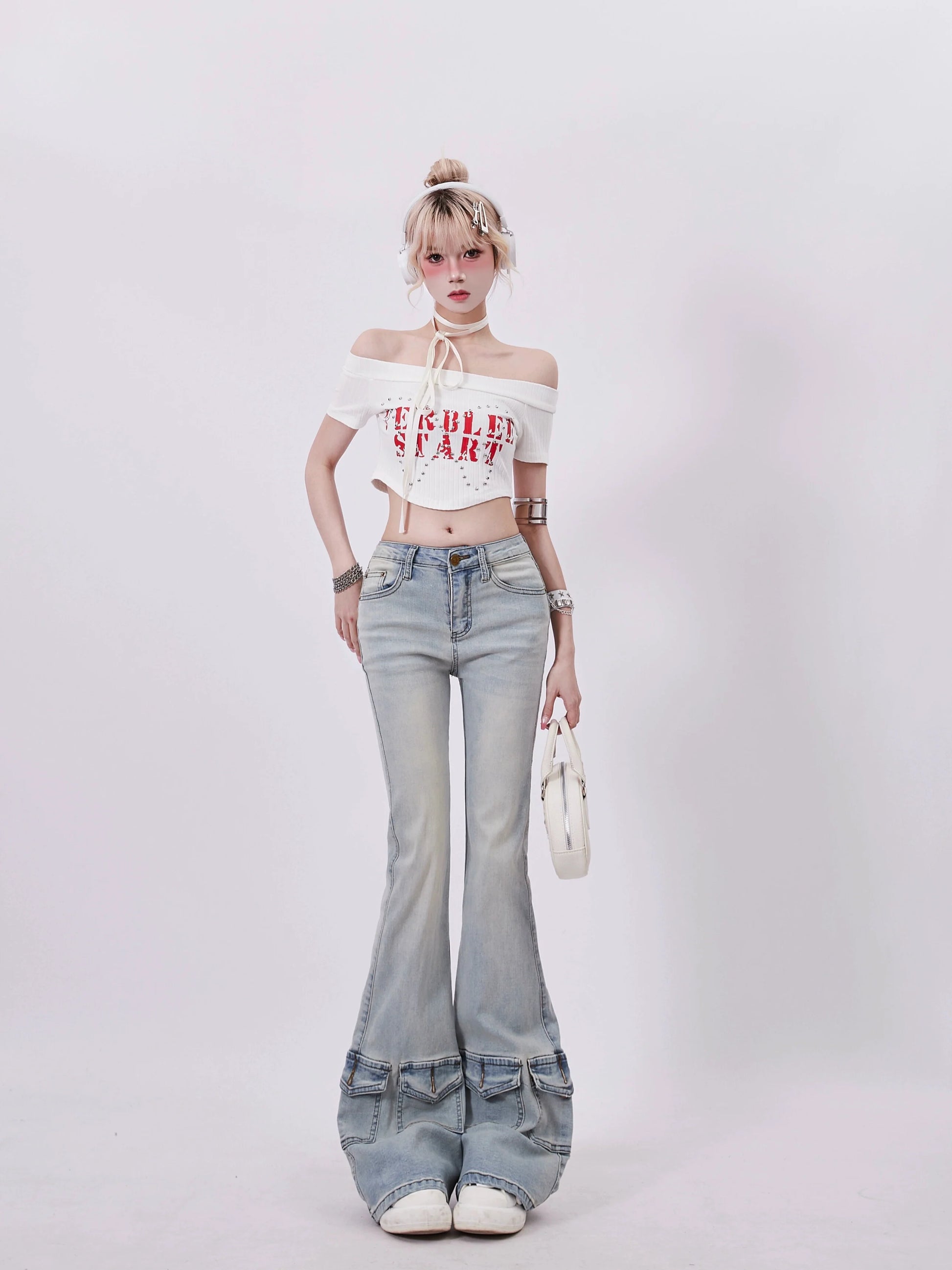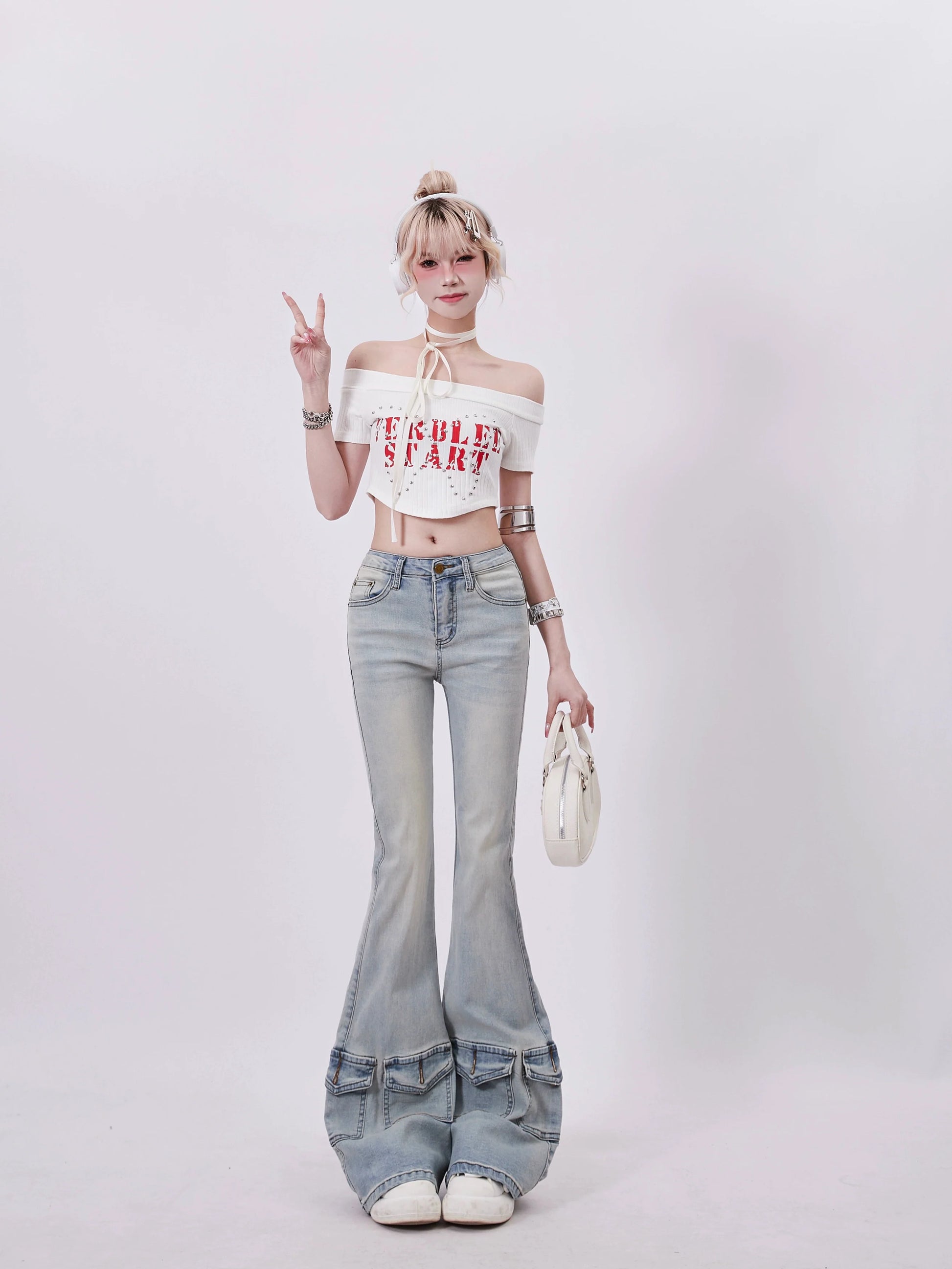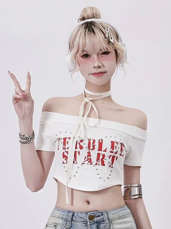 Schulterfreies, kurzes amerikanisches Top mit Logo